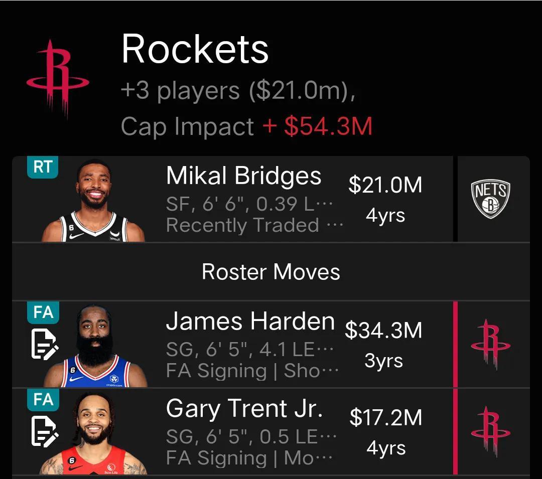 火箭並沒有放棄追逐籃網布裏奇斯,據火箭隊記者Iko表示,火箭總經理斯通將在休賽期繼續向布里奇斯發起追求,並可能重新提交一份交易報價,從籃網隊得到布里奇斯。