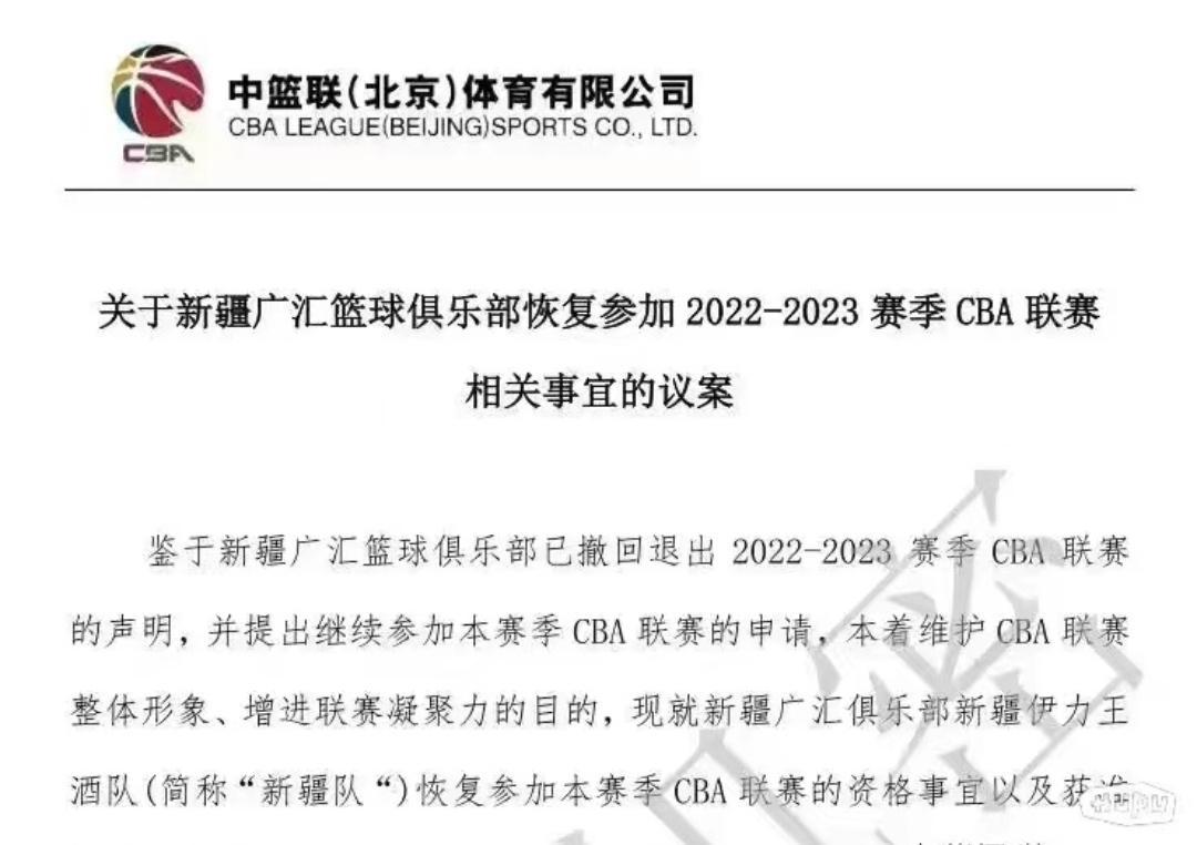 依照這份內部公告來看,CBA公司稱新疆廣匯籃球俱樂部已經撤回退出2022-2023賽季CBA聯賽的聲明,並提出繼續參加本賽季CBA聯賽的申請,官方本着維護CBA聯賽整體形象、增進聯賽凝聚力的目的,就新疆男籃恢復本賽季CBA聯賽的資格事宜,與各股東進行商討。