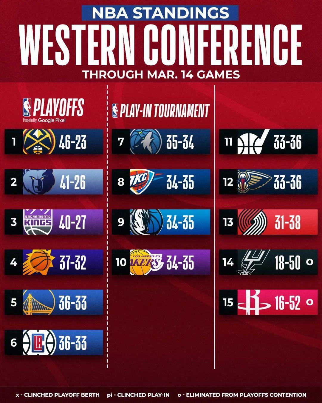 這個特點,從目前緊張膠着的西部季後賽以及附加賽席位爭奪上,就能再明顯不過地看出。3月15日的比賽打完之後,西部第4的太陽與西部第13的開拓者之間,差距僅有6個勝場。而位列附加賽區域內的四支球隊——森林狼、雷霆、獨行俠和湖人,後面三支球隊的戰績一模一樣,森林狼領先的優勢也僅有一個勝場。在常規賽進入到收官階段的當下,這些球隊的排名與位置,可能每一天都會出現全新的變化。
