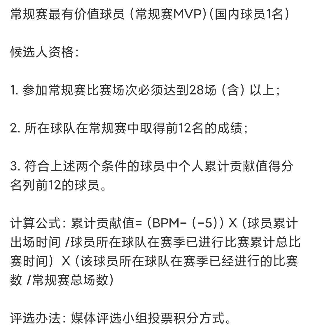 剛剛,CBA官方對外公佈了新賽季常規賽MVP和總決賽MVP的競選辦法,和上賽季一樣,官方又創造了一系列複雜的公式,來作爲評選兩個獎項的關鍵條件,像常規賽MVP候選人,就必須出場28場以上,球隊排名必須在前12位,同時還必須與球員的出場時間和BPM指數相關,換言之,新賽季常規賽MVP,依舊將球員的出勤率作爲一項重要考察指標,而遼寧球星郭艾倫,很有可能因爲隊友整體實力太強,他的出場時間相對較少,而再次被排除在常規賽MVP的後選名單之外。