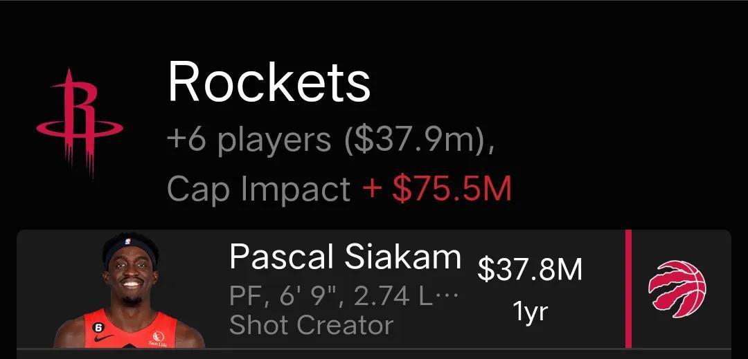 美媒建議火箭在休賽期追求猛龍前鋒西亞卡姆,並提出火箭可能送出小波特、史密斯、泰特和4個首輪籤(包含2個籃網首輪)的交易籌碼,得到猛龍全明星前鋒西亞卡姆。