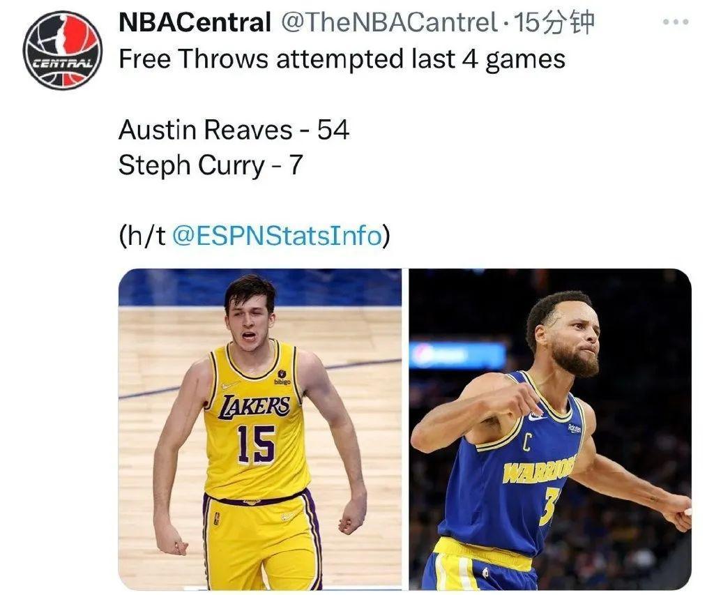 媒體統計,庫裏本賽季至今只有三次單場罰球上雙,分別是12、11、11。而最近一週,裏夫斯的罰球數分別是13、9、18、13,三次單場罰球上雙 。