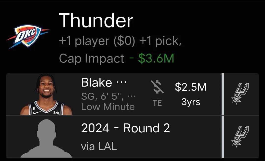 雷霆送出肯德里克-威廉姆斯,得到馬刺球員布雷克韋斯利和2024年次輪選秀權。