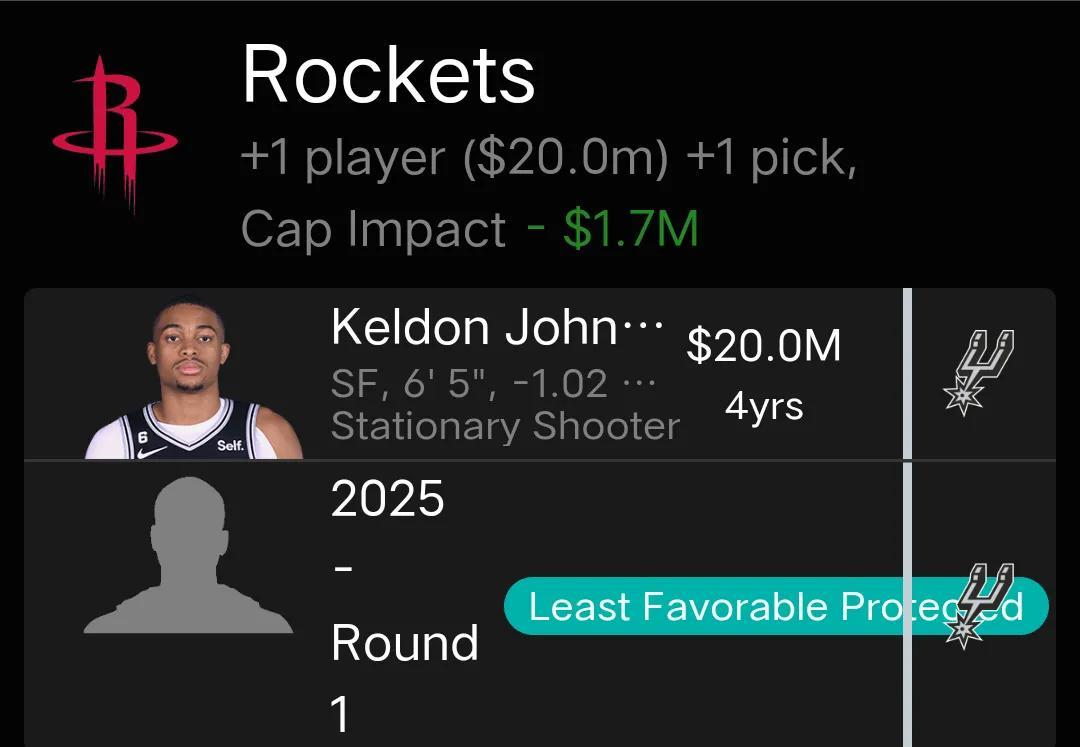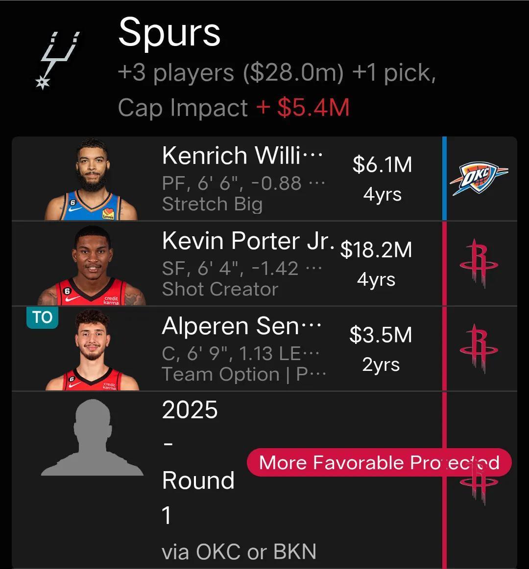 馬刺送出凱爾登約翰遜、布雷克韋斯利,2024年次輪選秀權,得到肯德里克-威廉姆斯、小波特、申京和2025年火箭的首輪互換權。
