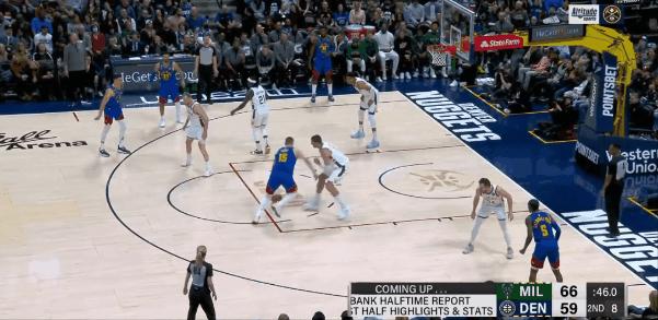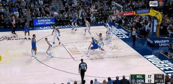 字母哥在上半場證明了他作爲聯盟頂級得分手的能力,掘金只能在他的身邊安排多個防守者——有時候把他包圍住,試圖減少他的出手角度,但他仍然能找到空位的隊友,但與此同時,掘金也破壞了很多個傳球。