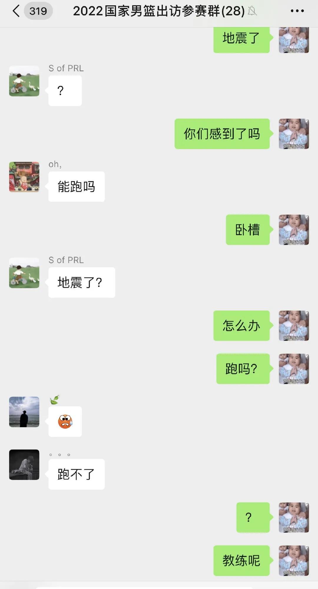 下午2點18分,經歷了一個多小時的平息之後,郭艾倫也是在網絡上發文,表示這次地震把他都晃迷糊了,這一夏天真是非凡體驗,與此同時,郭艾倫也曬出了一張,自己與隊友在羣裏的聊天記錄,他向其他隊友詢問是否感覺地震了,並且還討論是否可以向外跑,最後郭艾倫還忍不住提出疑問,這個時候“教練呢?”