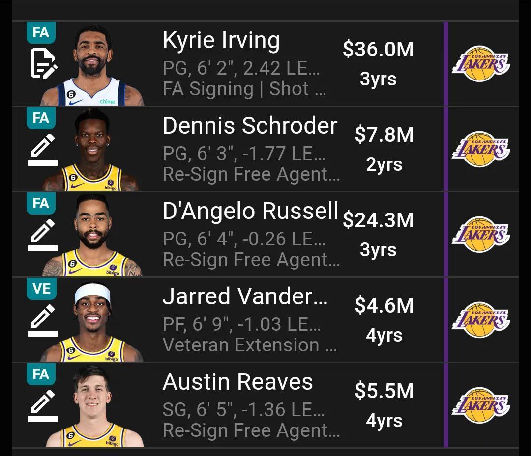 簽下歐文後湖人將處理隊內球員的續約,湖人會留下拉塞爾、範德比爾特和裏夫斯,爲考慮爲三位球員提供一份不少於三年的續約合同。