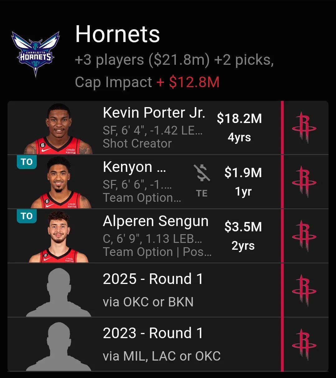 據美媒nba分析網報道,火箭隊有意得到黃蜂隊主力控衛鮑爾,並計劃送出一筆5換1的交易報價方案,具體內容爲,火箭隊送出球隊的先發後衛小凱文波特,潛力前鋒小肯揚馬丁,以及有小約基奇之稱的年輕中鋒申京,2023年雄鹿首輪選秀權,2025年火箭首輪選秀權,得到黃蜂隊的控衛鮑爾。