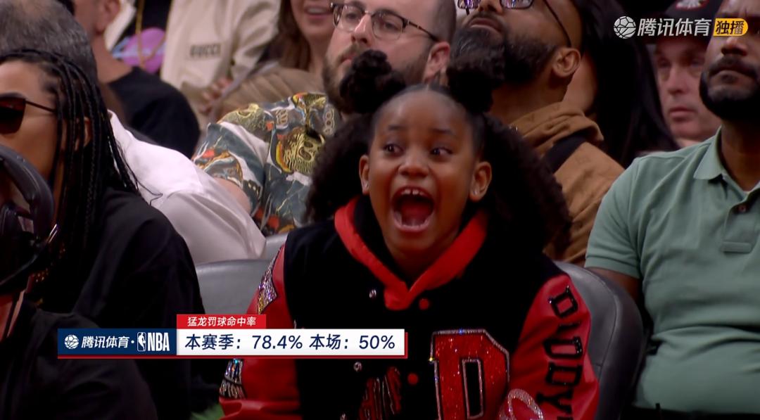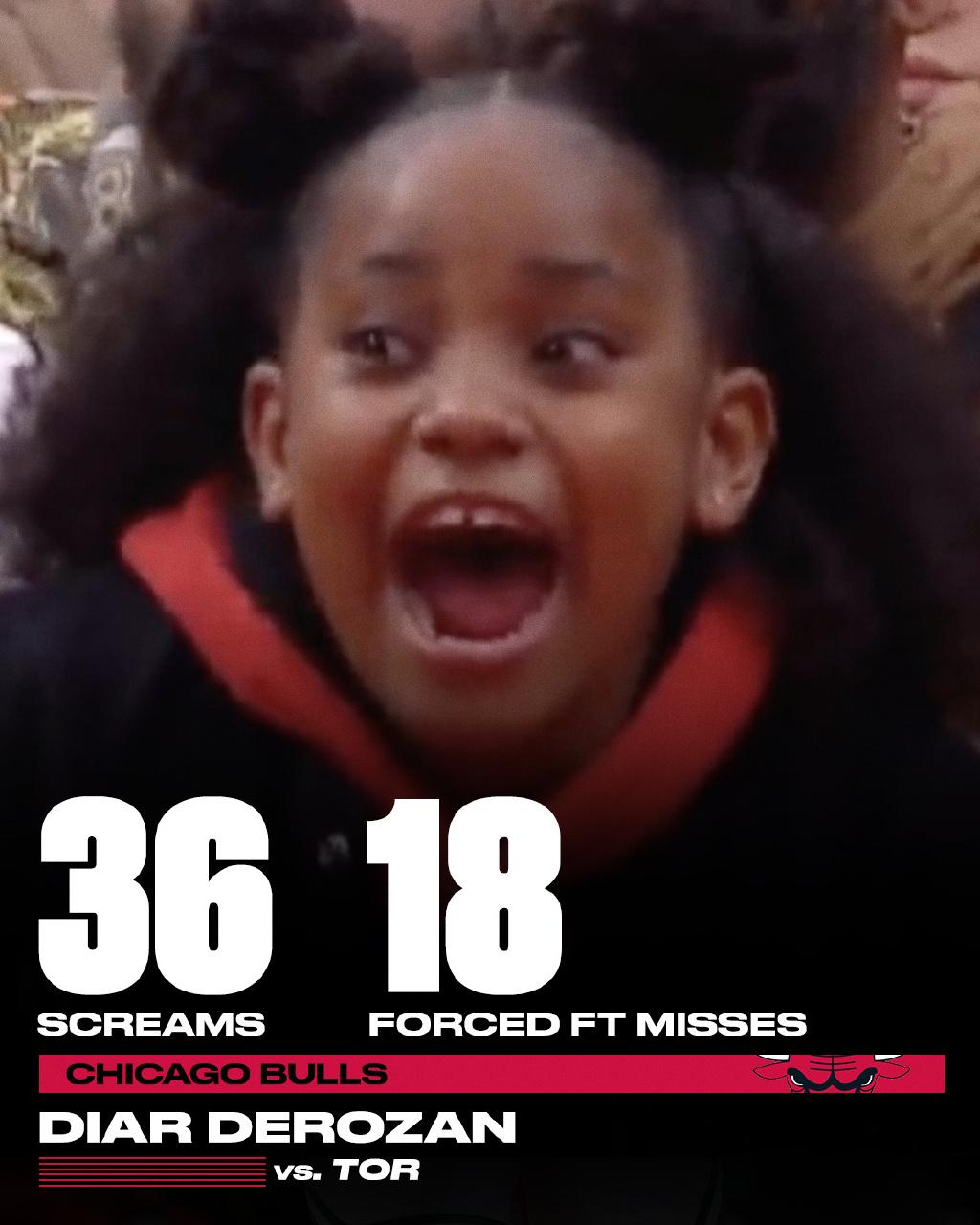 您沒看錯,不是德羅贊,是他女兒。今天猛龍全隊罰球命中率僅有50%,這是輸球的最大原因之一。而他們每次站上罰球線,德羅讚的女兒都會用極高的分貝尖叫。