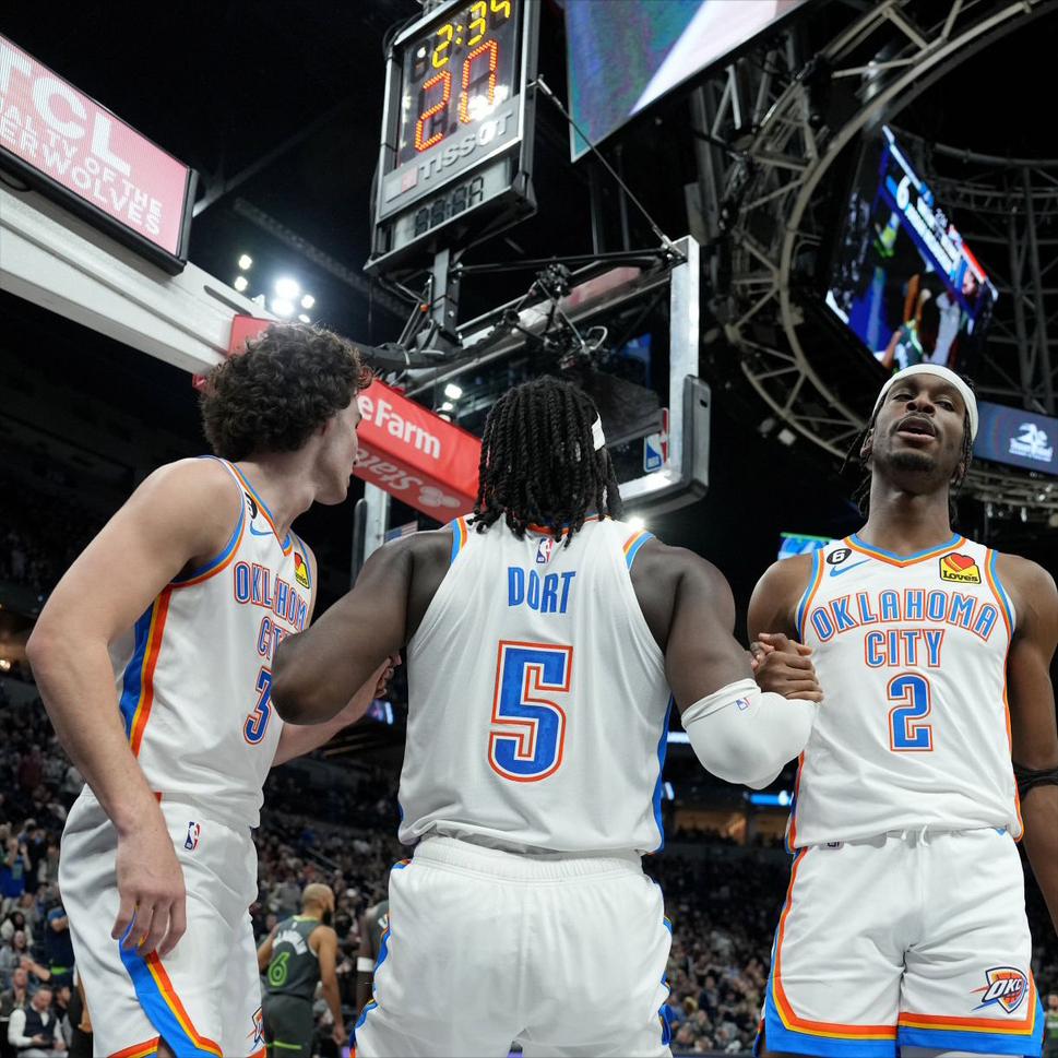 今天這場球,新版三巨頭合砍了90分!亞歷山大,32分5籃板3助攻3搶斷,吉迪,31分9籃板10助攻,多爾特,27分5籃板,奠定基調的首節貢獻14分。