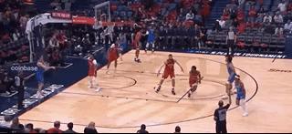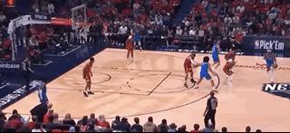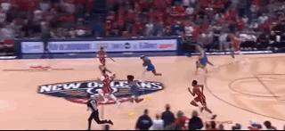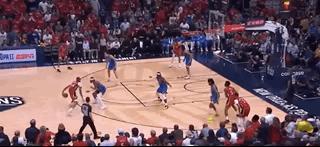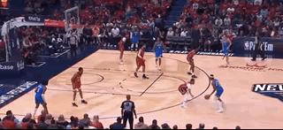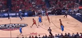 所以就算鵜鶘放他兩步、預判對了他的突破路線,也很難防住他的上籃。亞歷山大的起步沒有福克斯和莫蘭特那麼迅猛,但在一號位上完全夠用,再配合他的鋒線身材,幾乎是倚着對手大步上籃,除了開頭“假模假式”打了個擋拆,後面完全是鋒線的風格。