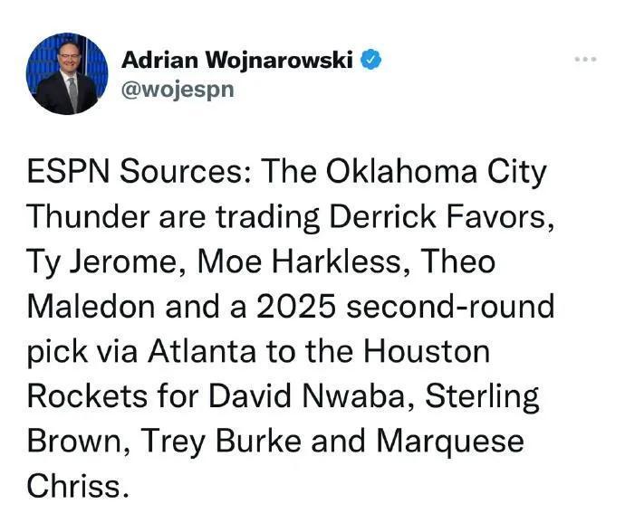 據名記woj爆料,火箭與雷霆達成一筆4換5的交易!火箭送出努瓦巴、斯特林布朗、伯克、克里斯,從雷霆隊得到費沃斯、傑羅姆、哈克利斯、馬樂東和一個未來次輪籤。