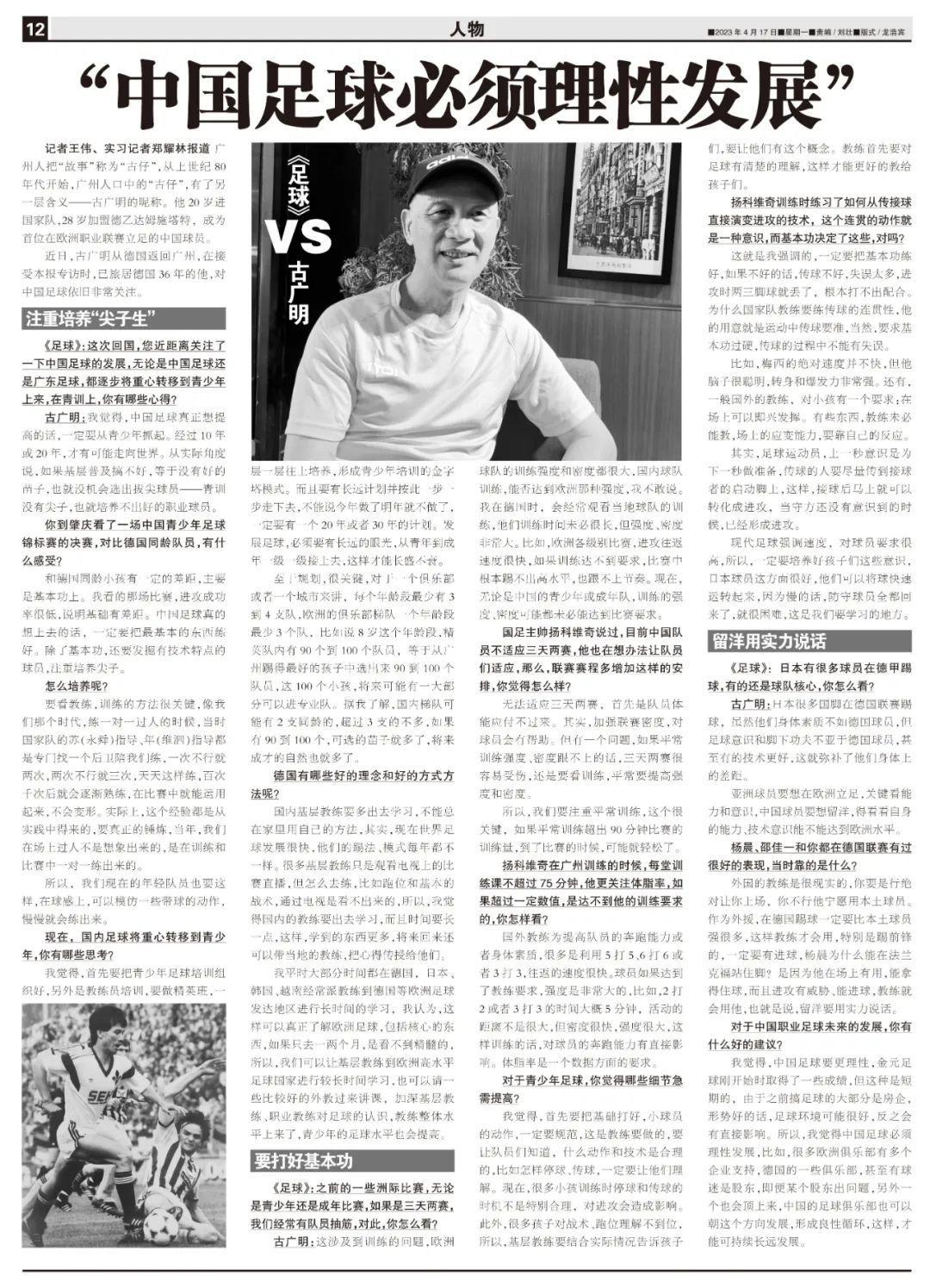 古廣明:我覺得,中國足球真正想提高的話,一定要從青少年抓起。經過10年或20年,纔有可能走向世界。從實際角度說,如果基層普及搞不好,等於沒有好的苗子,也就沒機會選出拔尖球員——青訓沒有尖子,也就培養不出好的職業球員。