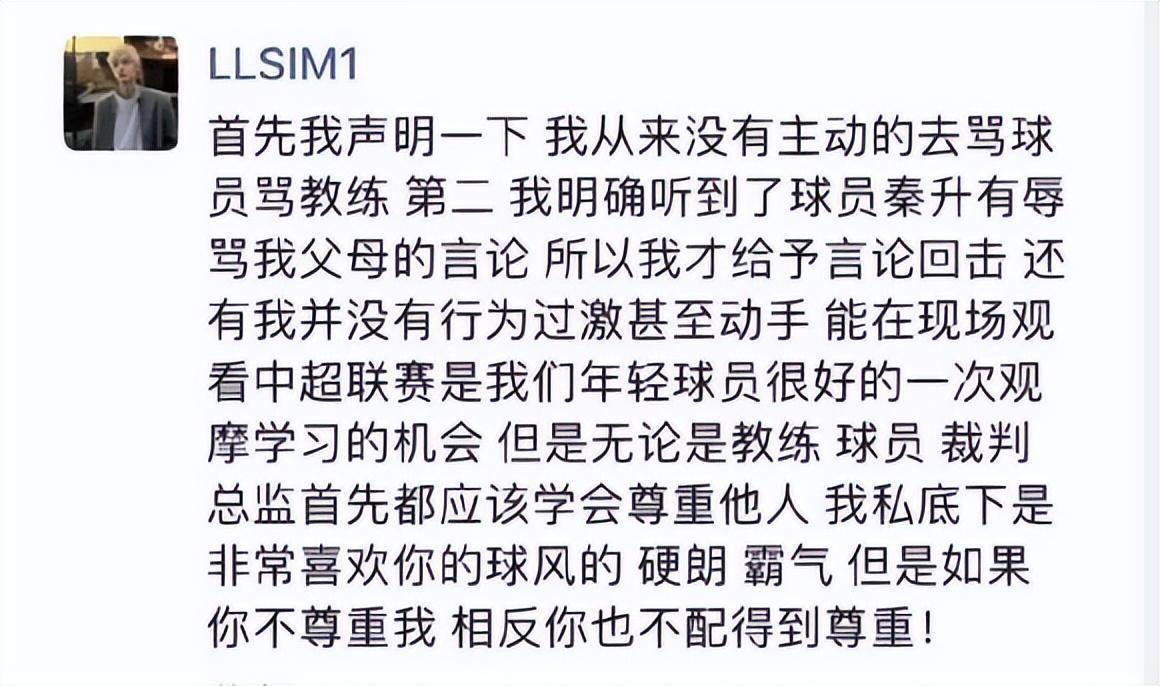 主裁判聽取邊裁判的意見後,向秦升出示了一張黃牌以示警告。賽後,秦升在社交平臺上寫道:“在合理的範圍內去拖延時間都能理解。但是你別去罵人,罵爹罵媽的!甚至去罵外國人!其實人家都能聽懂!”