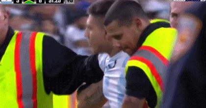 梅西剛替補登場10分鐘後,便有球迷衝進球場要求跟梅西合影,被安保人員迅速控制被送出去。