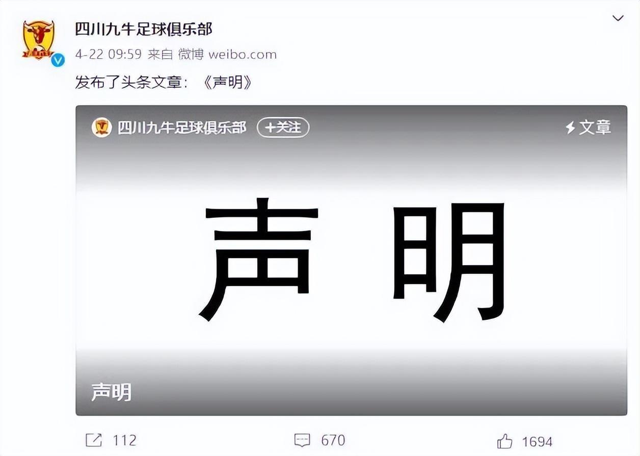 特約記者戴拿報道 23日下午,四川九牛客場1比0戰勝石家莊功夫,但比這一賽果更引人關注的,是22日上午四川九牛足球俱樂部發布的一則公告。