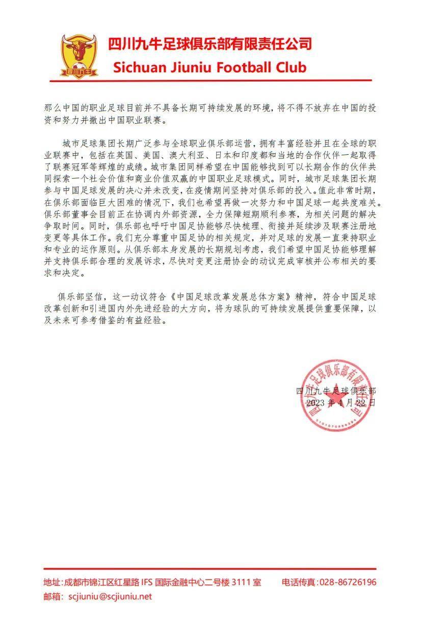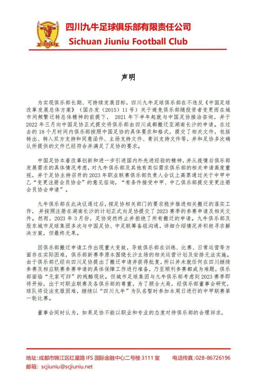 公告稱,“九牛俱樂部按照註冊在湖南長沙的計劃正式向足協提交了2023賽季的參賽申請及相關文件。然而,2023年3月份,足協突然終止並拒絕了所有搬遷的申請……由於搬遷申請工作遭遇重大變故,導致俱樂部在訓練、比賽、日常運營等方面存在實際困難,特別是俱樂部已經向四川足協提出搬遷申請並獲得批覆,所以並未就任何在四川繼續參賽及相應聯賽參賽申請的具體保障工作進行準備,俱樂部面臨‘無家可歸’的窘迫境地。”