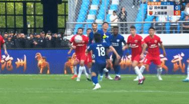 第45分鐘,奧斯卡背身拿球仍然能從容送出挑傳,滄州後衛楊雲解圍失誤,武磊轉身凌空抽射破門,上海海港1-0。