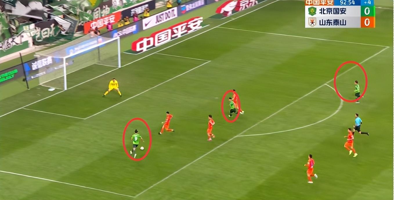 在第93分鐘時,北京國安發動最後反擊,前場三打三,但張玉寧最後處理有點拉胯,沒有選擇傳給遠端的隊友就算了,最後左腳的打門軟綿無力,跟回傳門將沒有什麼區別。