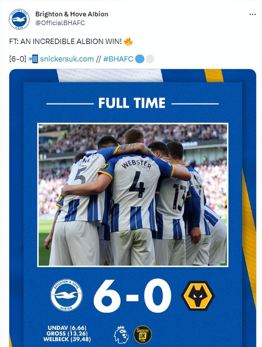 英超第34輪,維爾貝克2射1傳,格羅斯和昂達夫分別雙響,大黑馬布萊頓主場6-0血洗狼隊,創隊史英超最大比分勝利紀錄。在狼隊身上全取3分後,布萊頓在少賽兩輪的情況下,跟聯賽第5的熱刺縮小分差至2分。