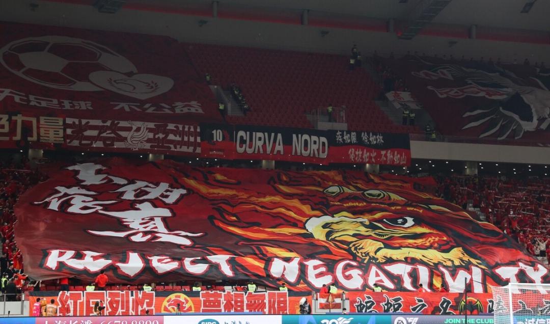 整個球場,充斥着紅色元素,海港爲這場比賽做足了戲份,賽前的開場儀式和燈光秀,讓夜幕下的球場無比炫麗,球迷打出的幾個巨型標語,也讓比賽尚未開始就已血脈噴張。