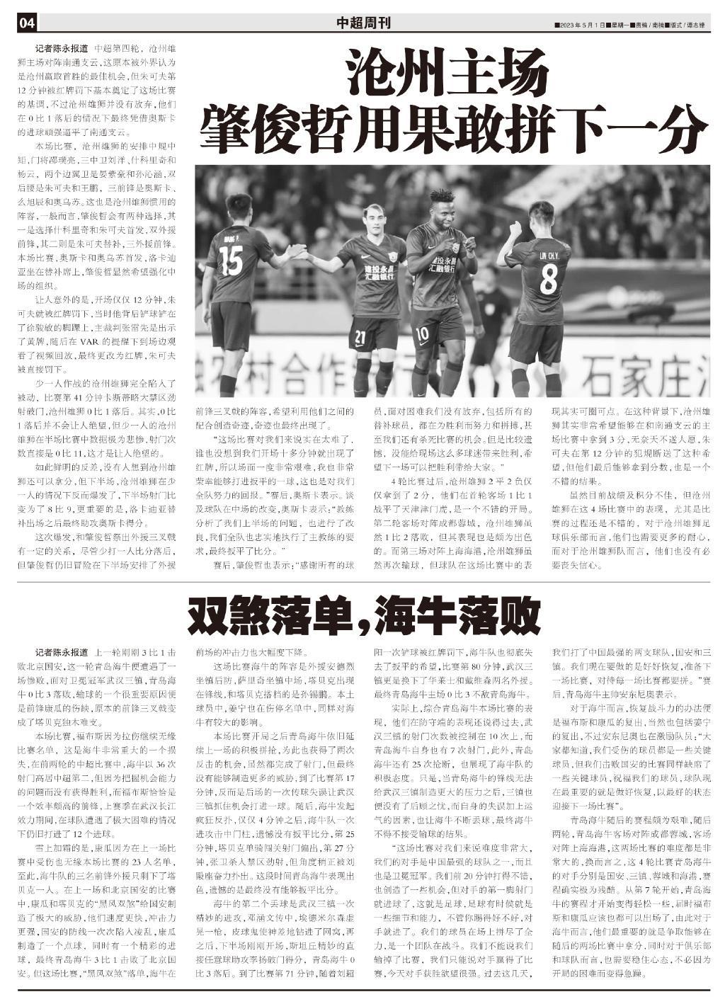 4輪比賽過後,滄州雄獅2平2負僅僅拿到了2分,他們在首輪客場1比1戰平了天津津門虎,是一個不錯的開局。第二輪客場對陣成都蓉城,滄州雄獅雖然1比2落敗,但其表現也是頗爲出色的。而第三場對陣上海海港,滄州雄獅雖然再次輸球,但球隊在這場比賽中的表現其實可圈可點。在這種背景下,滄州雄獅其實非常希望能夠在和南通支雲的主場比賽中拿到3分,無奈天不遂人願,朱可夫在第12分鐘的犯規斷送了這種希望,但他們最後能夠拿到分數,也是一個不錯的結果。
