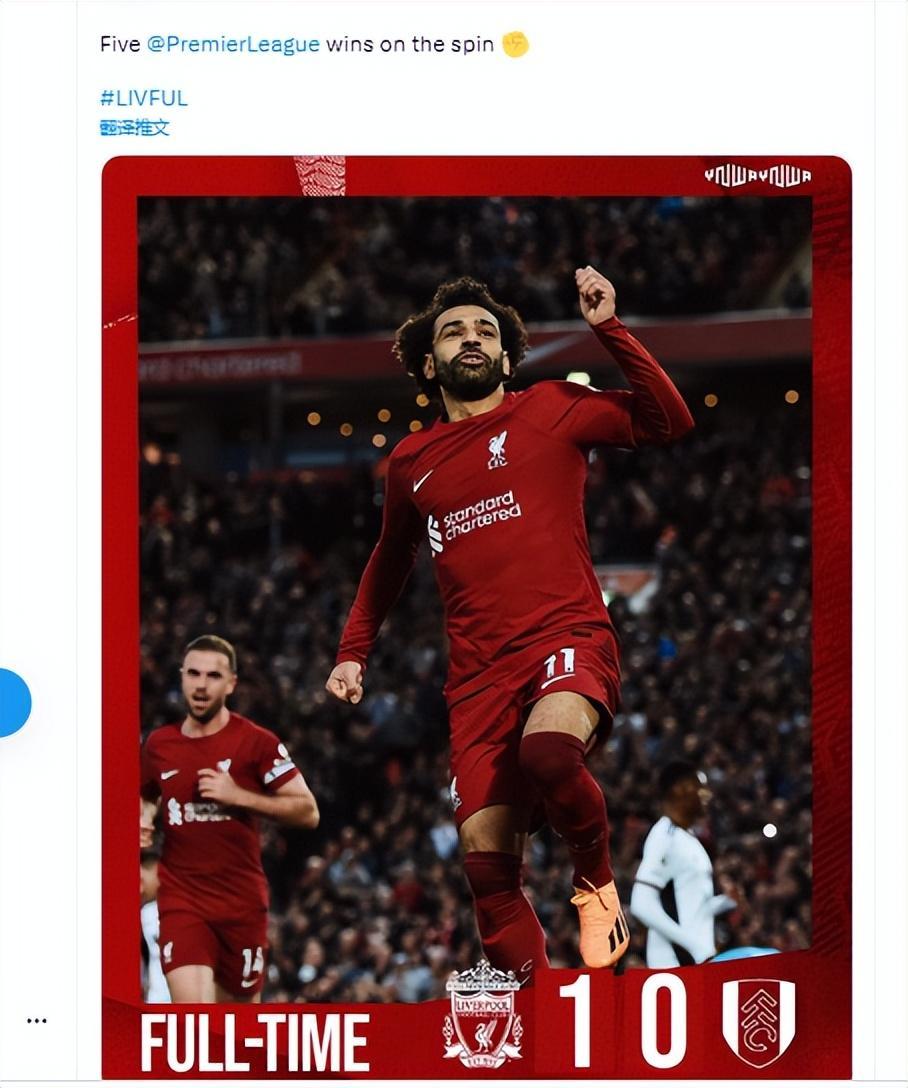 英超第28輪補賽,薩拉赫利用點球打進全場唯一進球,最終利物浦主場1-0小勝富勒姆,取得聯賽5連勝。不過,利物浦雖然坐穩了聯賽第5,但在多賽2輪的情況下仍然落後身前的曼聯4分。