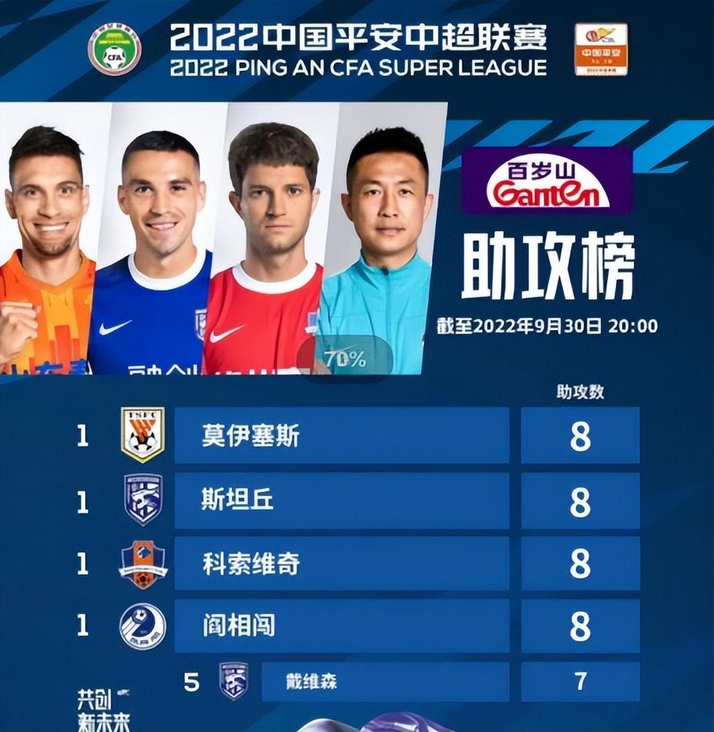 在助攻榜方面,4人並列第一,36歲的閻相闖唯一一位本土球員。戴維森以7個助攻排名第5,不過他是中超直接參與進球數最多的球員(19球),比16球2助攻的馬爾康還要多1球。