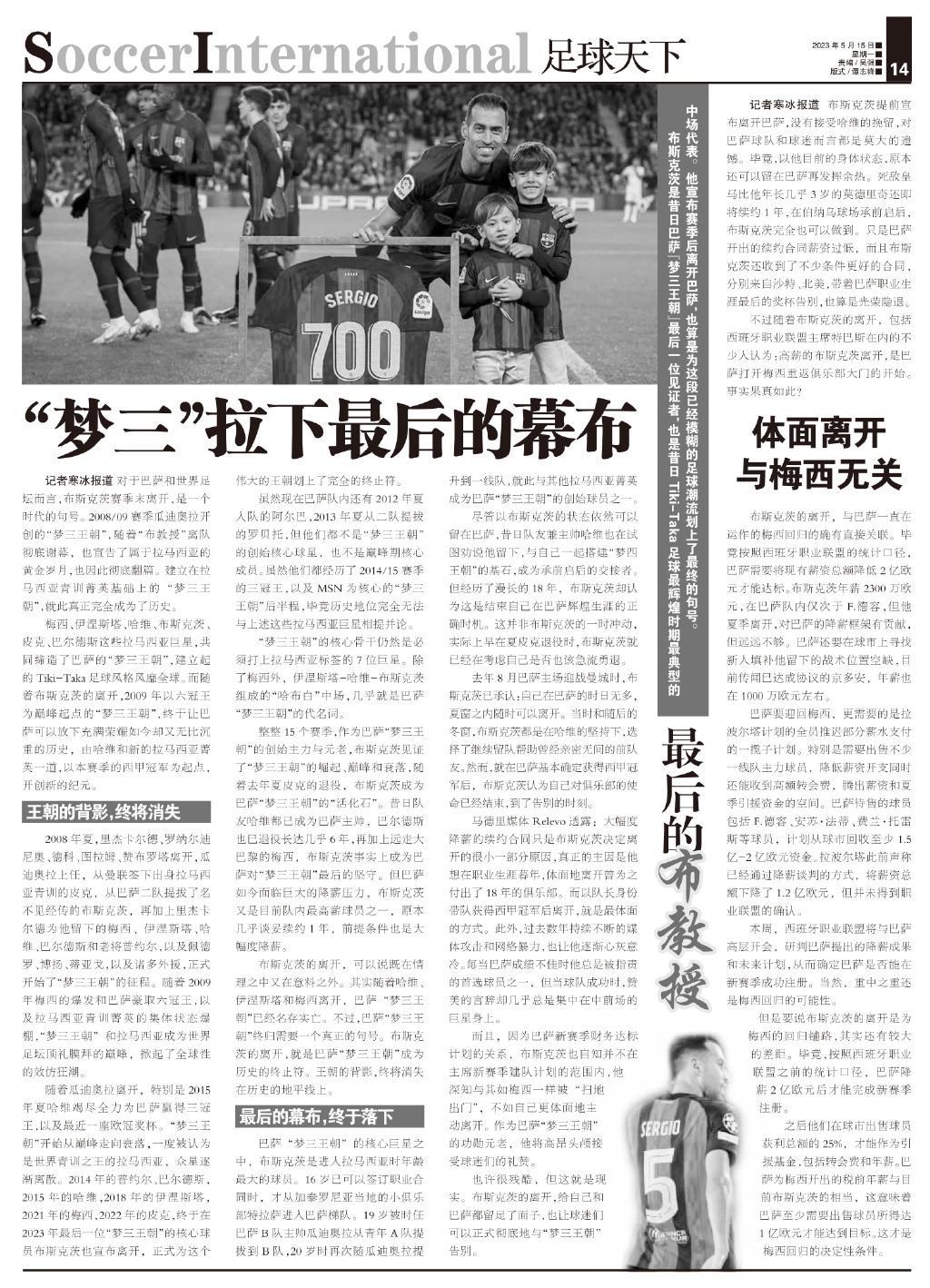 而且,因爲巴薩新賽季財務達標計劃的關係,布斯克茨也自知並不在主席新賽季建隊計劃的範圍內,他深知與其如梅西一樣被“掃地出門”,不如自己更體面地主動離開。作爲巴薩“夢三王朝”的功勳元老,他將高昂頭顱接受球迷們的禮讚。