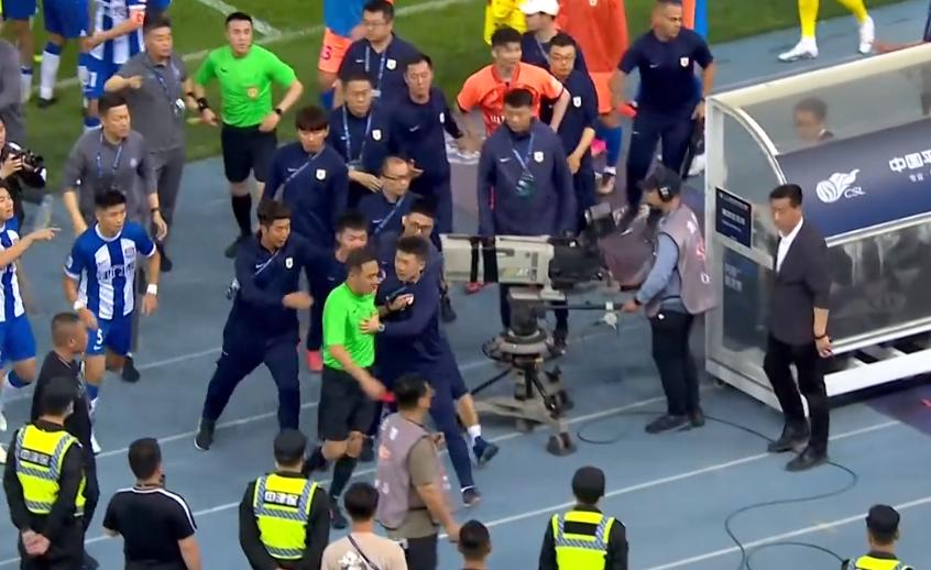 最終,主裁判劉威一路追到球員通道前給賈德松出示紅牌。而泰山的助教法比奧因爲攔路,同樣也被主裁判劉威出示紅牌罰下。