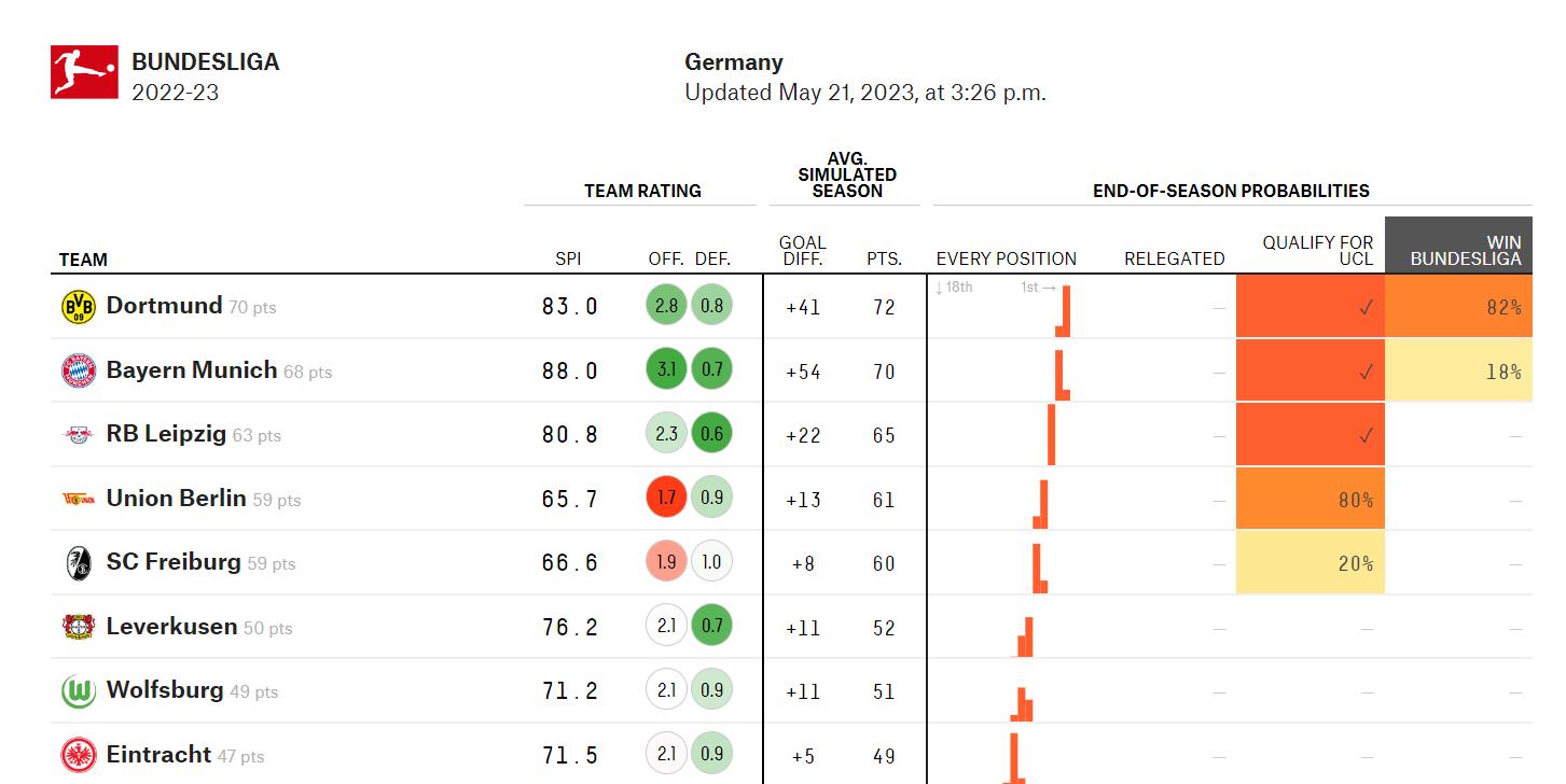 根據機構最新預測,多特最新奪冠概率飆升至82%,而拜仁的奪冠可能性只剩下18%。最後一輪,多特將坐鎮主場面對美因茨,他們只要贏球即可奪冠。