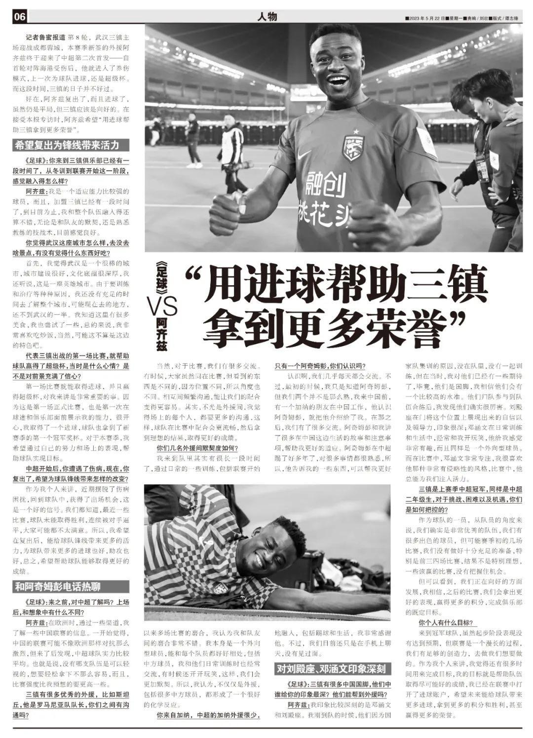 好在,阿齊茲復出了,而且進球了,雖然仍是平局,但三鎮應該是向好的。在接受本報專訪時,阿齊茲希望“用進球幫助三鎮拿到更多榮譽”。