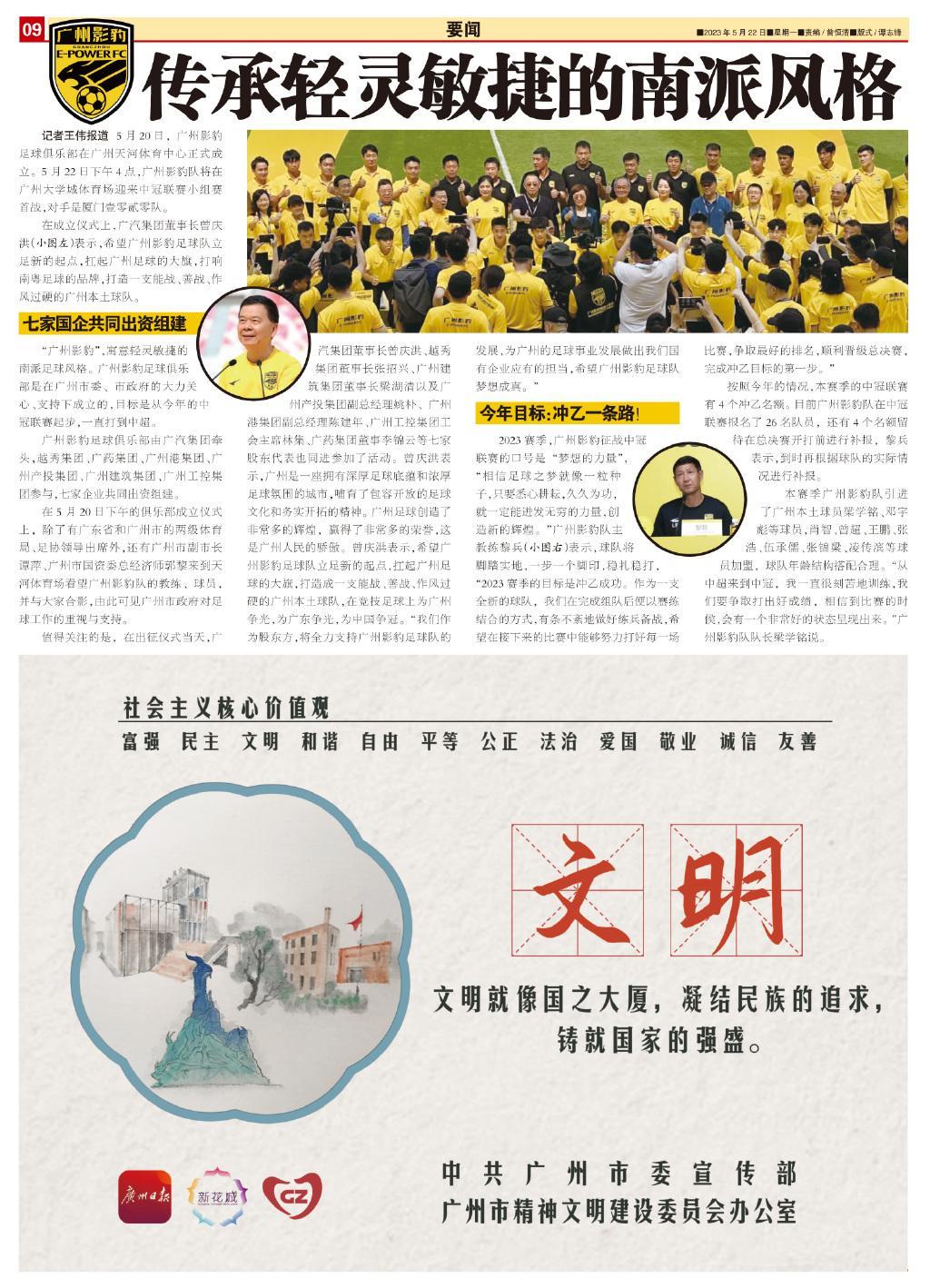 值得關注的是,在出徵儀式當天,廣汽集團董事長曾慶洪、越秀集團董事長張招興、廣州建築集團董事長梁湖清以及廣州產投集團副總經理姚樸、廣州港集團副總經理陳建年、廣州工控集團工會主席林集、廣藥集團董事李錦雲等七家股東代表也同進參加了活動。曾慶洪表示,廣州是一座擁有深厚足球底蘊和濃厚足球氛圍的城市,哺育了包容開放的足球文化和務實開拓的精神。廣州足球創造了非常多的輝煌,贏得了非常多的榮譽,這是廣州人民的驕傲。曾慶洪表示,希望廣州影豹足球隊立足新的起點,扛起廣州足球的大旗,打造成一支能戰、善戰、作風過硬的廣州本土球隊,在競技足球上爲廣州爭光,爲廣東爭光,爲中國爭冠。“我們作爲股東方,將全力支持廣州影豹足球隊的發展,爲廣州的足球事業發展做出我們國有企業應有的擔當,希望廣州影豹足球隊夢想成真。”