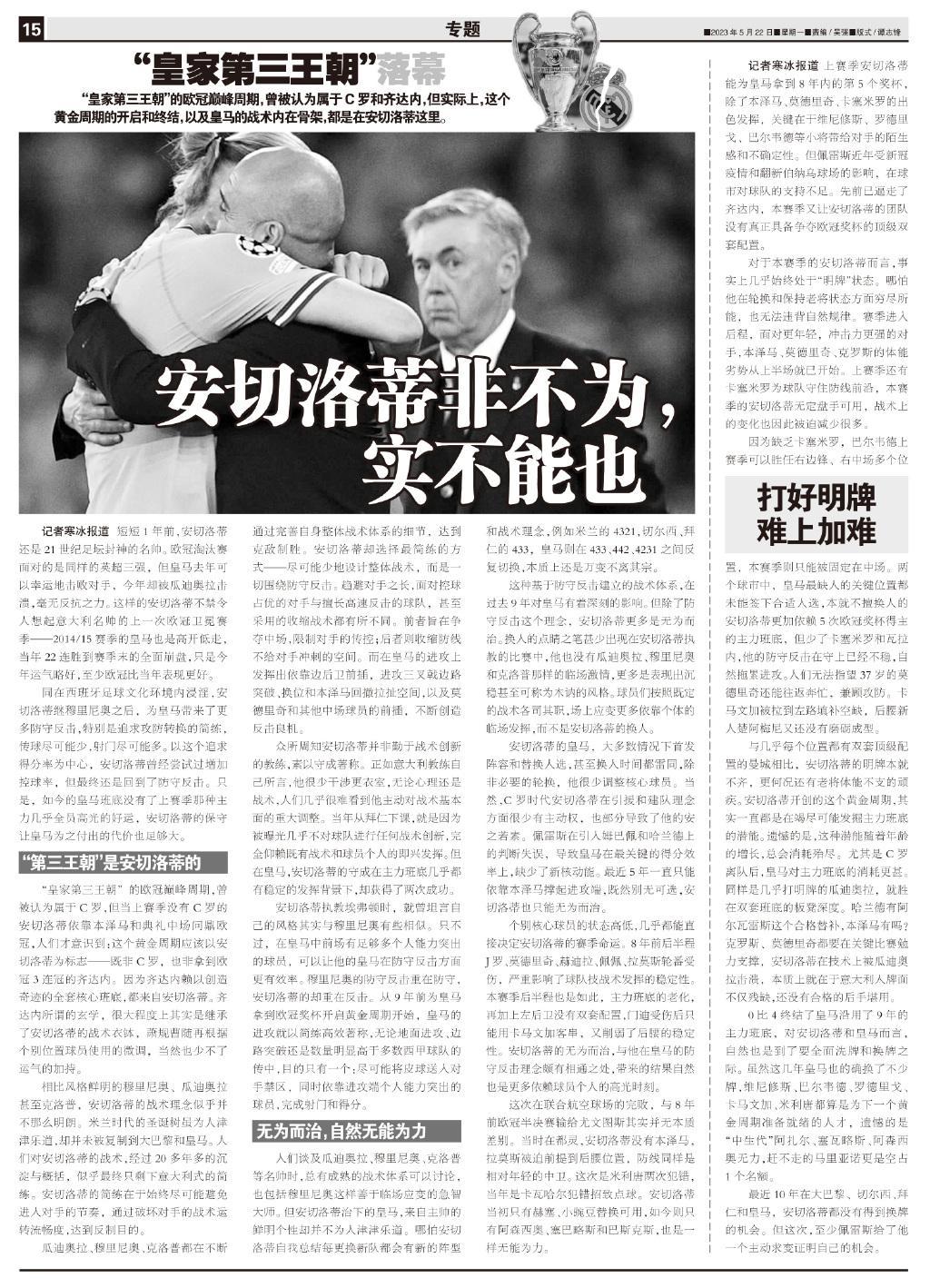 “皇家第三王朝”的歐冠巔峯週期,曾被認爲屬於C羅,但當上賽季沒有C羅的安切洛蒂依靠本澤馬和典禮中場問鼎歐冠,人們才意識到:這個黃金週期應該以安切洛蒂爲標誌——既非C羅,也非拿到歐冠3連冠的齊達內。因爲齊達內賴以創造奇蹟的全套核心班底,都來自安切洛蒂。齊達內所謂的玄學,很大程度上其實是繼承了安切洛蒂的戰術衣鉢,蕭規曹隨再根據個別位置球員使用的微調,當然也少不了運氣的加持。