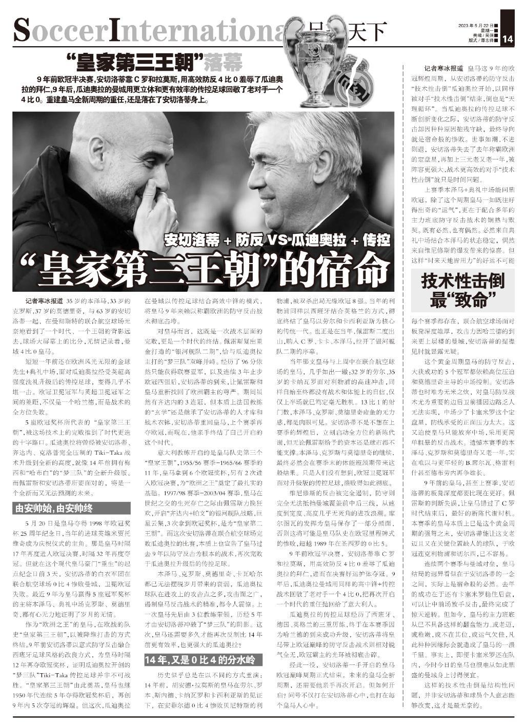 瓜迪奧拉的傳控足球經歷了西班牙、德國、英格蘭的三重歷練,終於在本賽季因爲哈蘭德的到來成功升級,安切洛蒂將皇馬帶上歐冠巔峯的防守反擊戰術則相對銳氣全無,歐冠霸主的光環被徹底擊碎。