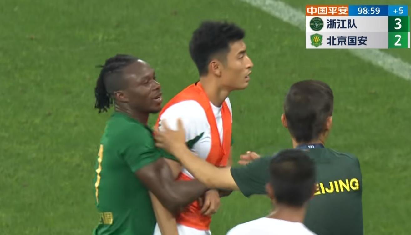 當國安這邊開出定位球,于大寶的打門被浙江隊門將趙博沒收時,時間已經來到第98分鐘,也就是說已超過法定補時3分鐘。當出現邊線球時,場下的浙江隊教練組要求主裁判吹哨結束比賽,這引起了國安球員的不滿。急着在場邊拿球開邊線球的高天意,推了浙江隊主帥喬迪一把。