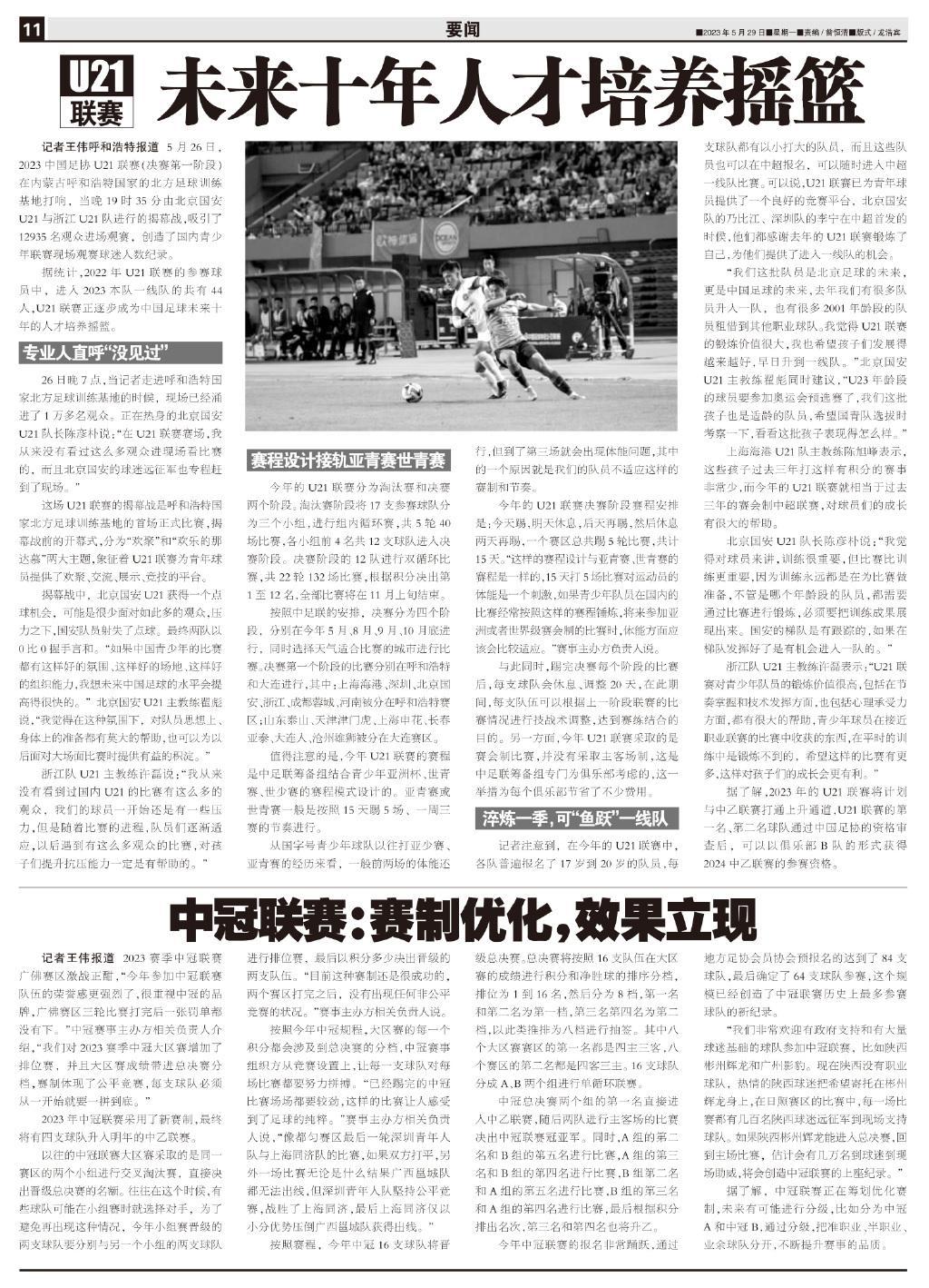 記者王偉呼和浩特報道 5月26日,2023中國足協U21聯賽(決賽第一階段)在內蒙古呼和浩特國家的北方足球訓練基地打響,當晚19時35分由北京國安U21與浙江U21隊進行的揭幕戰,吸引了12935名觀衆進場觀賽,創造了國內青少年聯賽現場觀賽球迷人數紀錄。