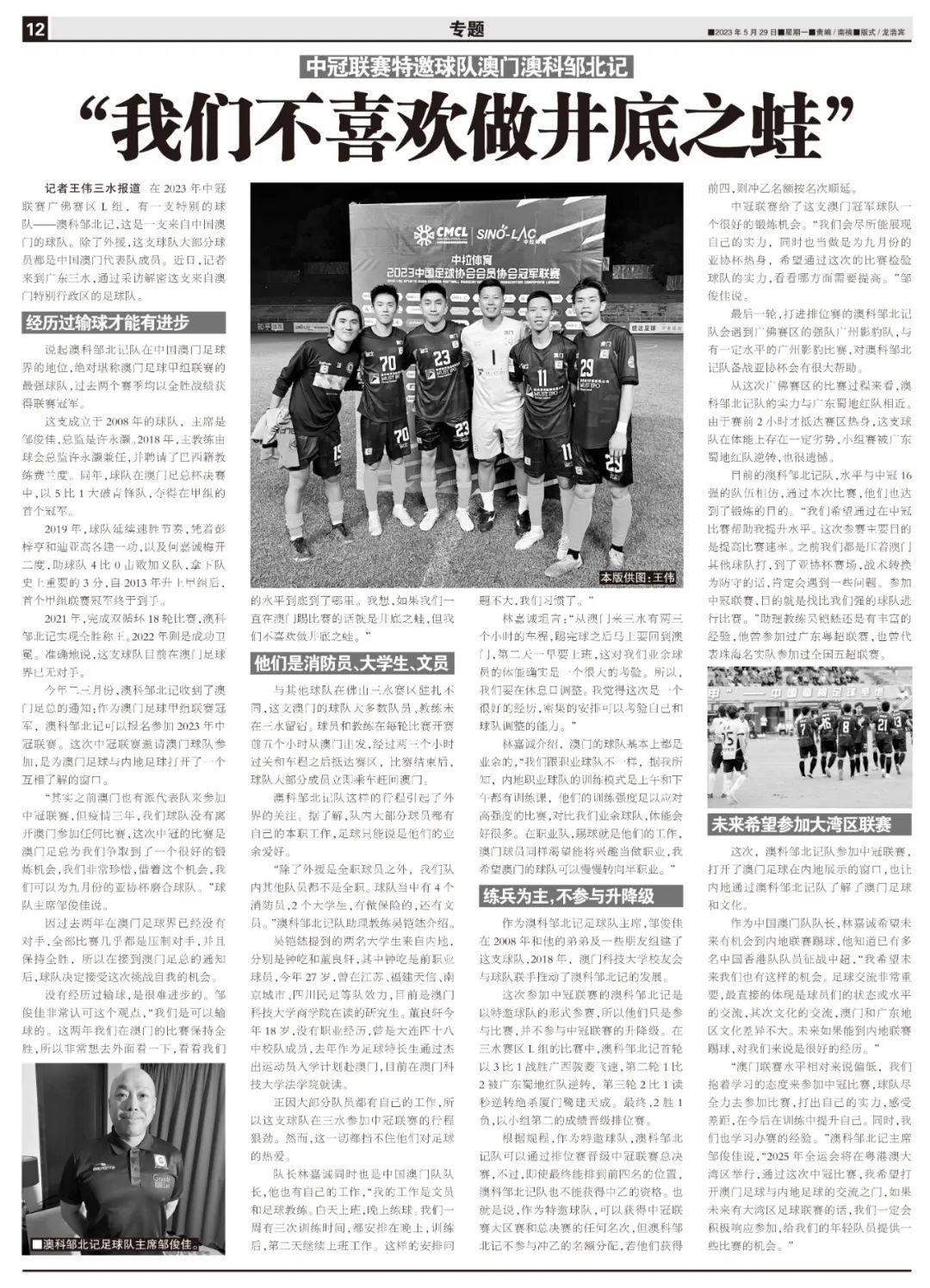 今年二三月份,澳科鄒北記收到了澳門足總的通知:作爲澳門足球甲組聯賽冠軍,澳科鄒北記可以報名參加2023年中冠聯賽。這次中冠聯賽邀請澳門球隊參加,是爲澳門足球與內地足球打開了一個互相瞭解的窗口。
