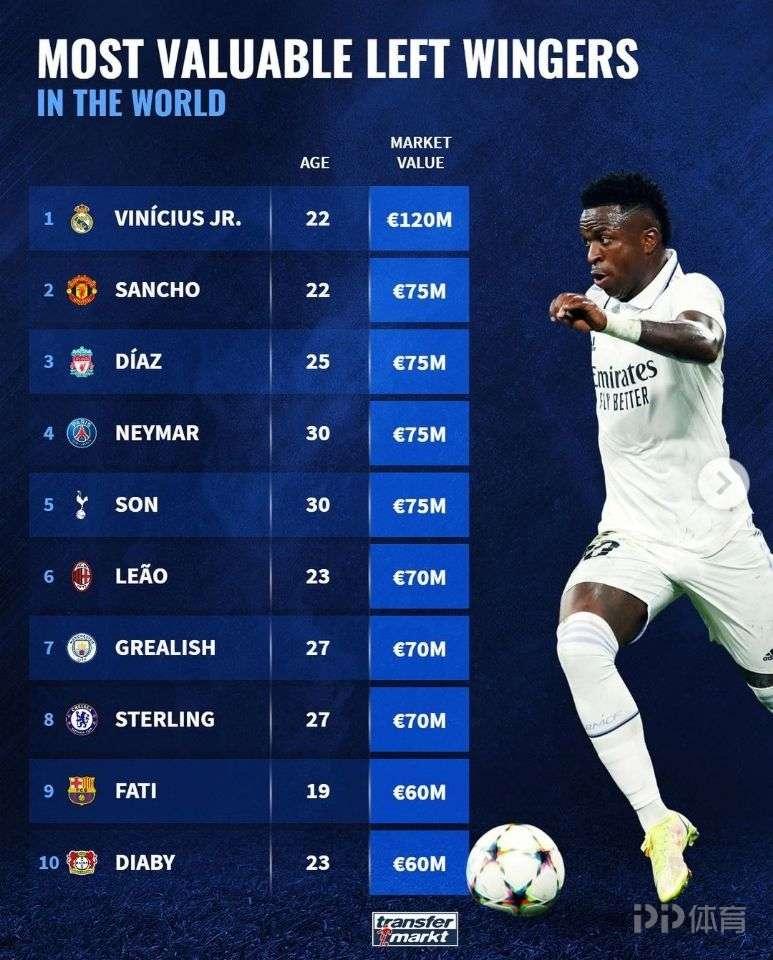 近日,德轉盤點了世界足壇左邊鋒球員身價榜,其中巴西球星維尼修斯以1.2億歐元位列榜首,西甲和歐冠賽場的優異表現讓皇馬邊鋒的身價暴漲。緊隨其後的是曼聯球員桑喬、利物浦球員路易斯-迪亞斯,內馬爾、孫興慜同樣爲7500萬歐元。