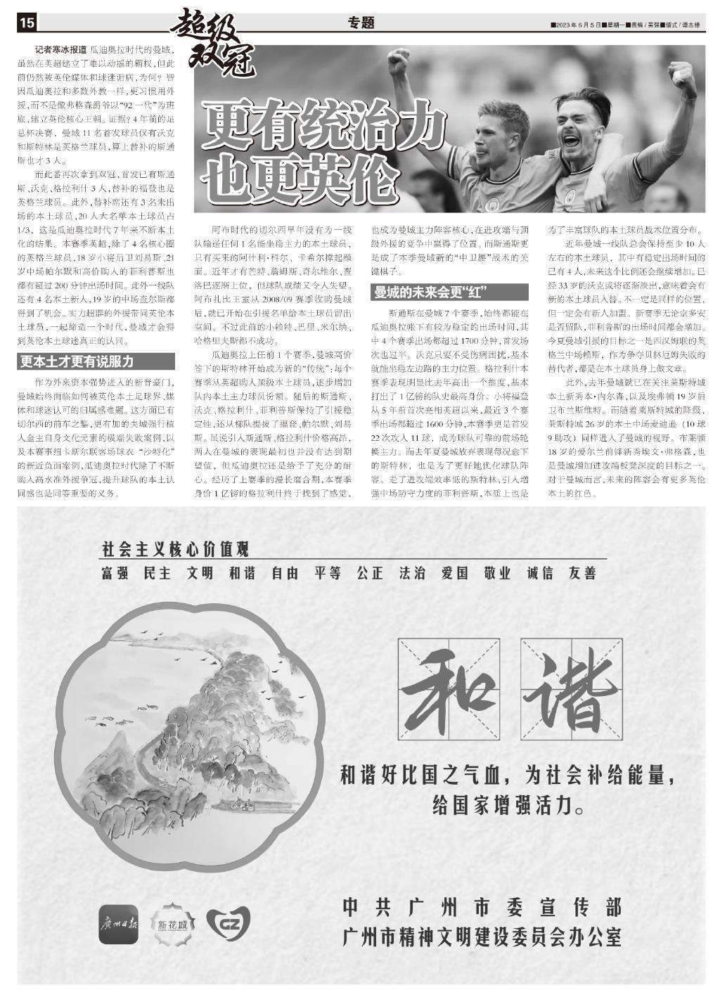 而此番再次拿到雙冠,首發已有斯通斯、沃克、格拉利什3人,替補的福登也是英格蘭球員。此外,替補席還有3名未出場的本土球員,20人大名單本土球員佔1/3,這是瓜迪奧拉時代7年來不斷本土化的結果。本賽季英超,除了4名核心圈的英格蘭球員,18歲小將後衛劉易斯、21歲中場帕爾默和高價購入的菲利普斯也都有超過200分鐘出場時間。此外一線隊還有4名本土新人,19歲的中場查爾斯都得到了機會。實力超羣的外援帶同英倫本土球員,一起締造一個時代,曼城纔會得到英倫本土球迷真正的認同。