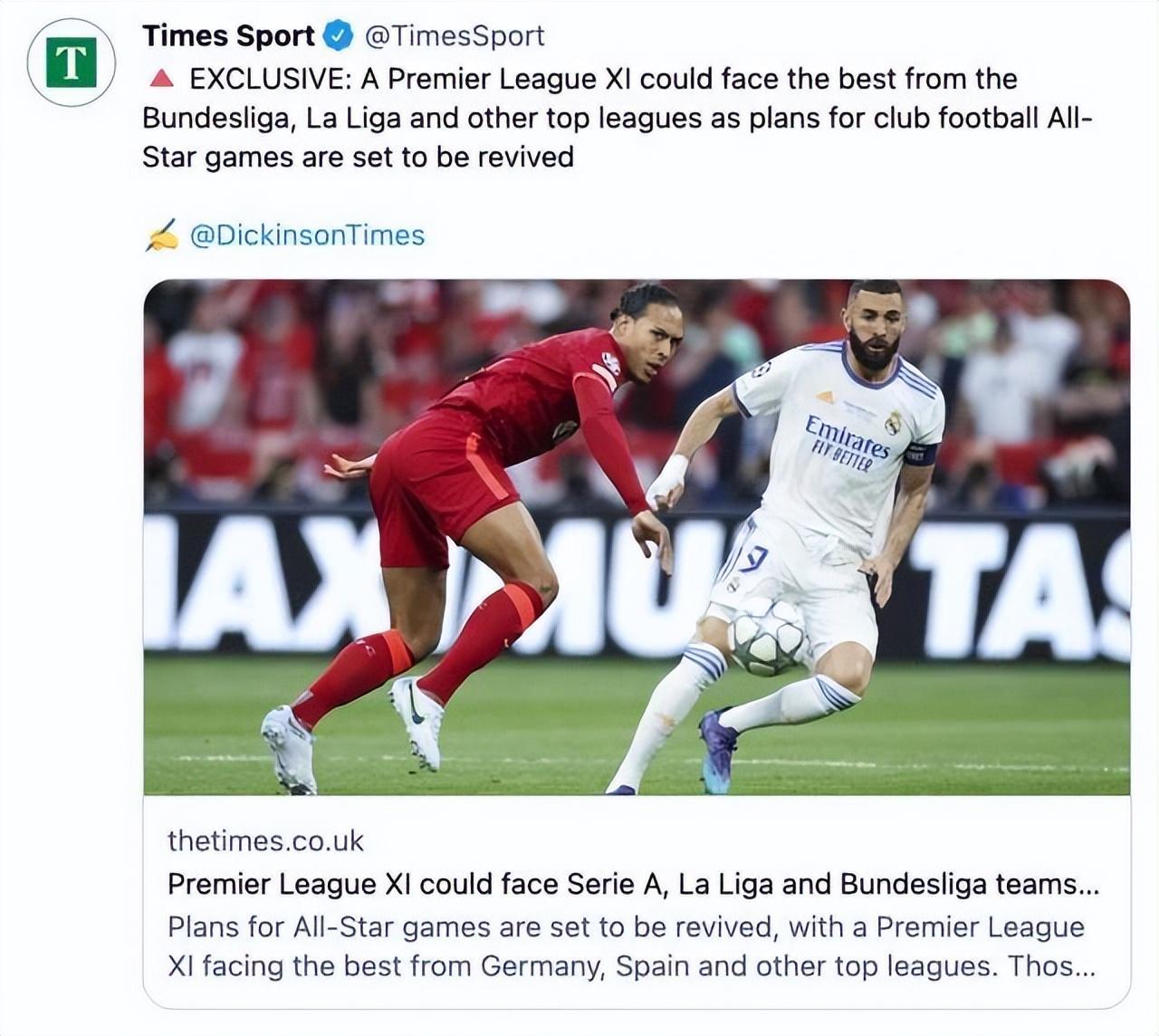 此前切爾西老闆伯利提出英超南北全明星賽的構想遭到廣泛吐槽,然而根據《泰晤士報》最新消息,全明星賽已在醞釀,有望在不久的將來成真。不過和伯利的設想不同的是,目前更被看好的方案是,英超組成一支全明星隊,與西甲、德甲等其他聯賽的全明星隊在世界各地進行巡迴比賽,以此擴大市場影響力。這樣的表演性比賽可安排在冬歇期或夏窗休賽期,與傳統的社區盾不產生衝突 。消息人士稱,爲了保持收視增長和提高海外轉播收入,這一新想法很可能被採用。