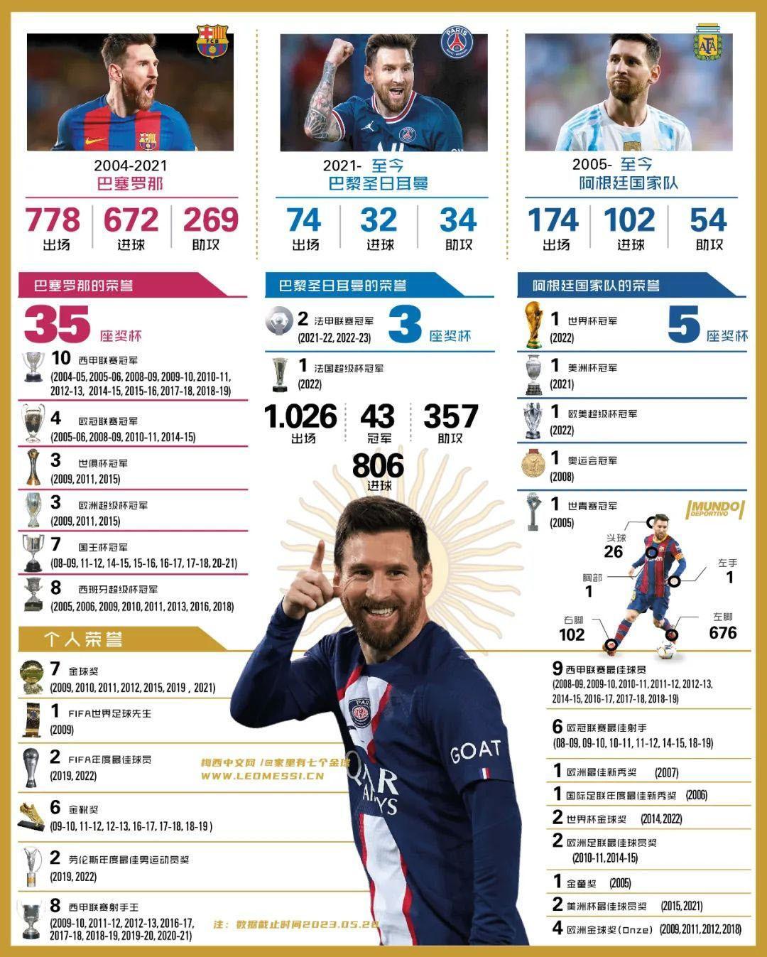 截止2023年5月,1026場正式比賽,43個冠軍,806個進球,357個助攻,7屆金球獎先生···這就是天才梅西給世界足壇的驚豔時光。