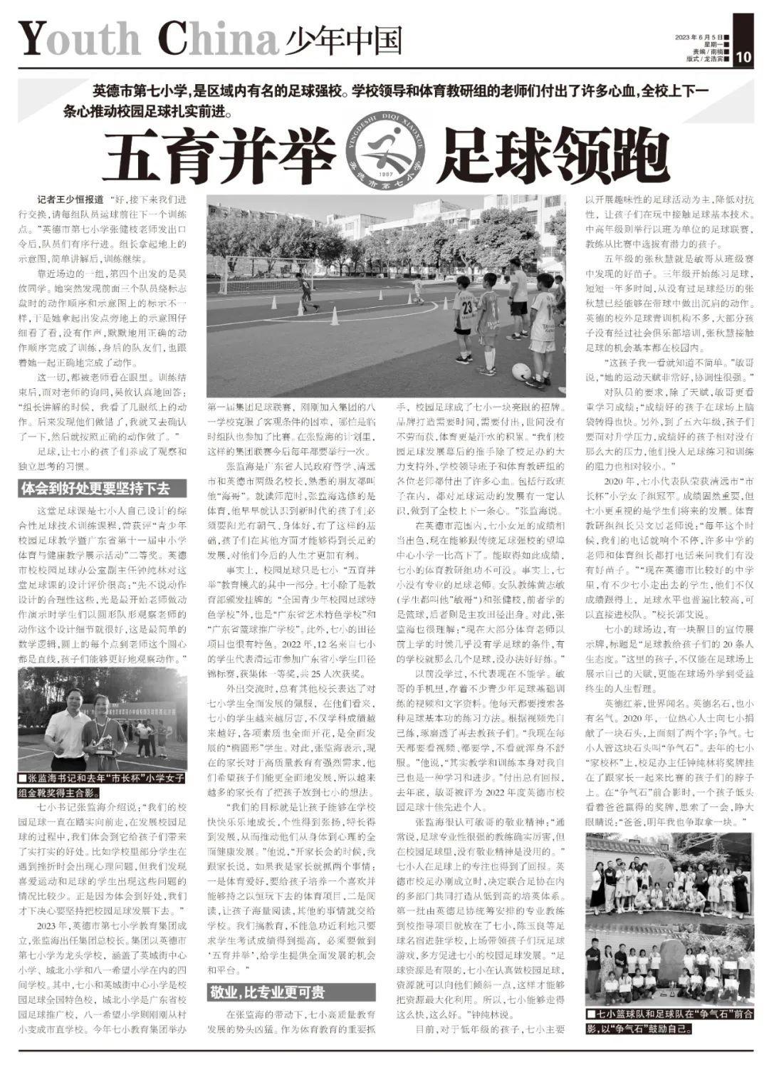 2020年,七小代表隊榮獲清遠市“市長盃”小學女子組冠軍。成績固然重要,但七小更重視的是學生們將來的發展。體育教研組組長吳文居老師說:“每年這個時候,我們的電話就響個不停,許多中學的老師和體育組長都打電話來問我們有沒有好苗子。”“現在英德市比較好的中學裏,有不少七小走出去的學生,他們不僅成績跟得上,足球水平也普遍比較高,可以直接進校隊。”校長郭艾說。
