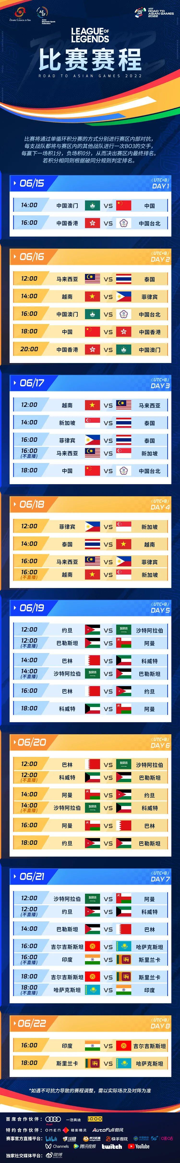 5月23日,由亞奧理事會(OCA)和亞洲電子體育聯合會(AESF)共同發起的“亞運征途”正式公佈對陣賽程。其中在備受矚目的英雄聯盟項目中,中國隊將在6月15日對陣中國澳門的比賽中完成首秀。