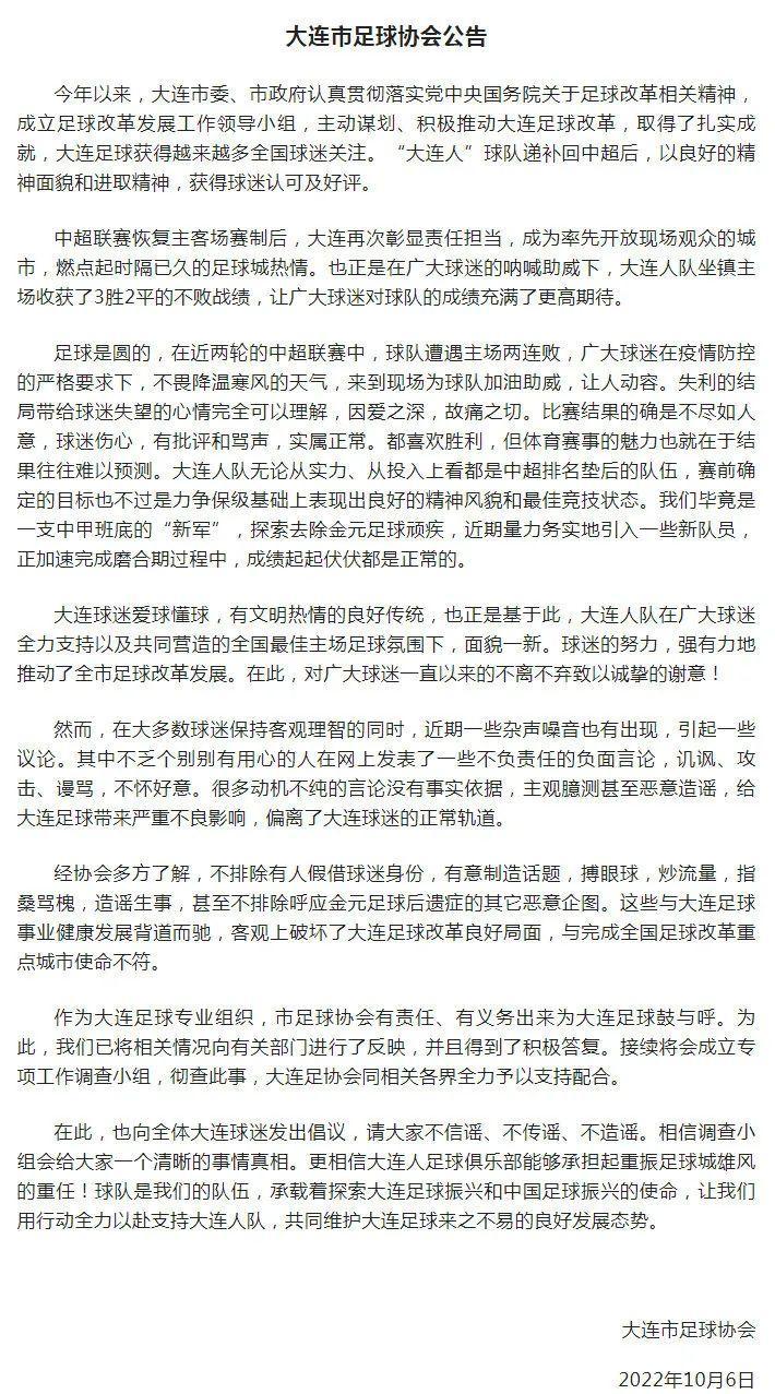 記者賈巖峯報道 國慶假期臨近尾聲的時候,大連市足協發佈了一條公告,似乎在對過去失利的兩場比賽進行總結和呼籲,呼籲球迷理性和冷靜觀賽。