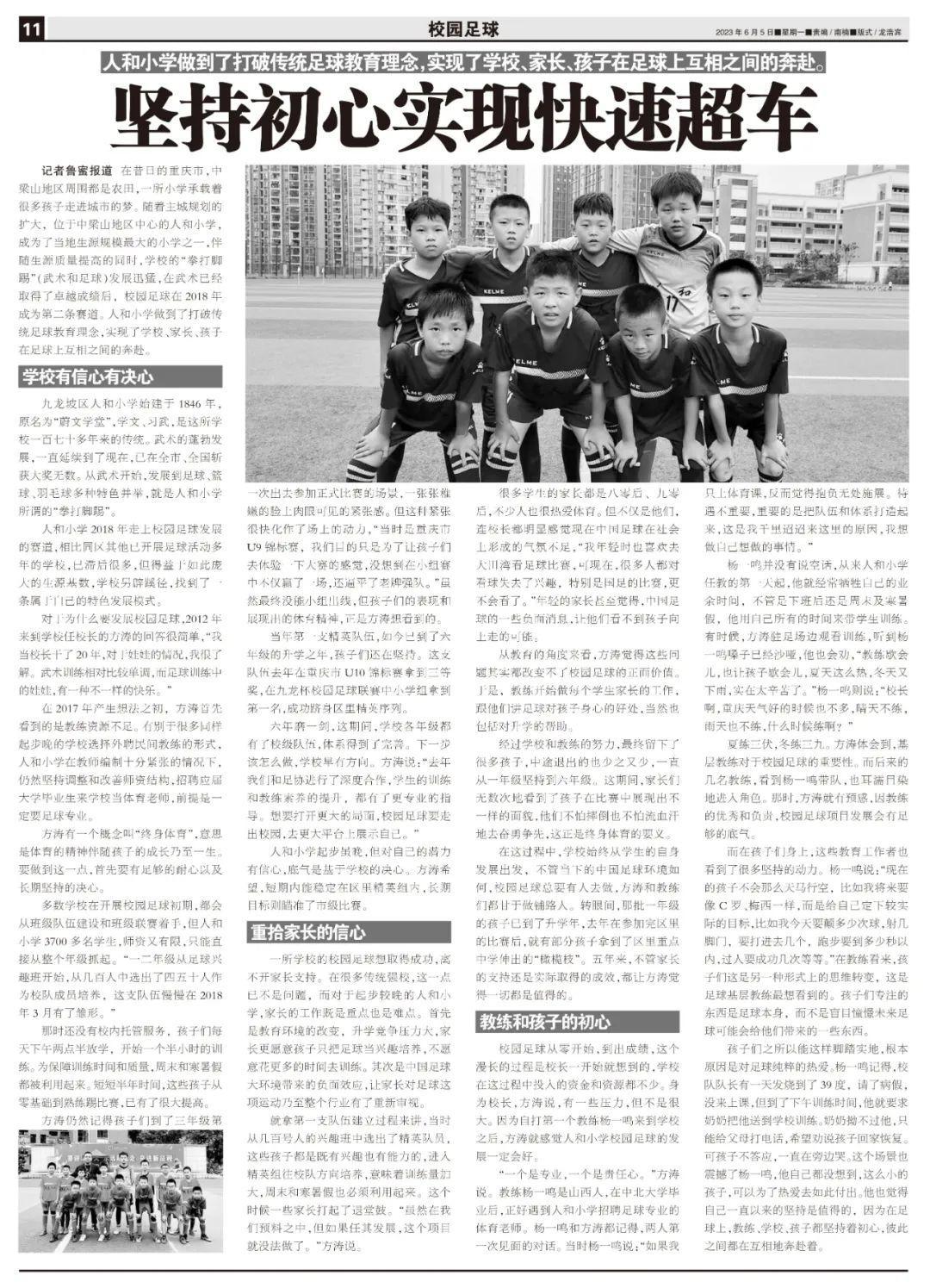記者魯蜜報道 在昔日的重慶市,中梁山地區周圍都是農田,一所小學承載着很多孩子走進城市的夢。隨着主城規劃的擴大,位於中梁山地區中心的人和小學,成爲了當地生源規模最大的小學之一,伴隨生源質量提高的同時,學校的“拳打腳踢”(武術和足球)發展迅猛,在武術已經取得了卓越成績後,校園足球在2018年成爲第二條賽道。人和小學做到了打破傳統足球教育理念,實現了學校、家長、孩子在足球上互相之間的奔赴。