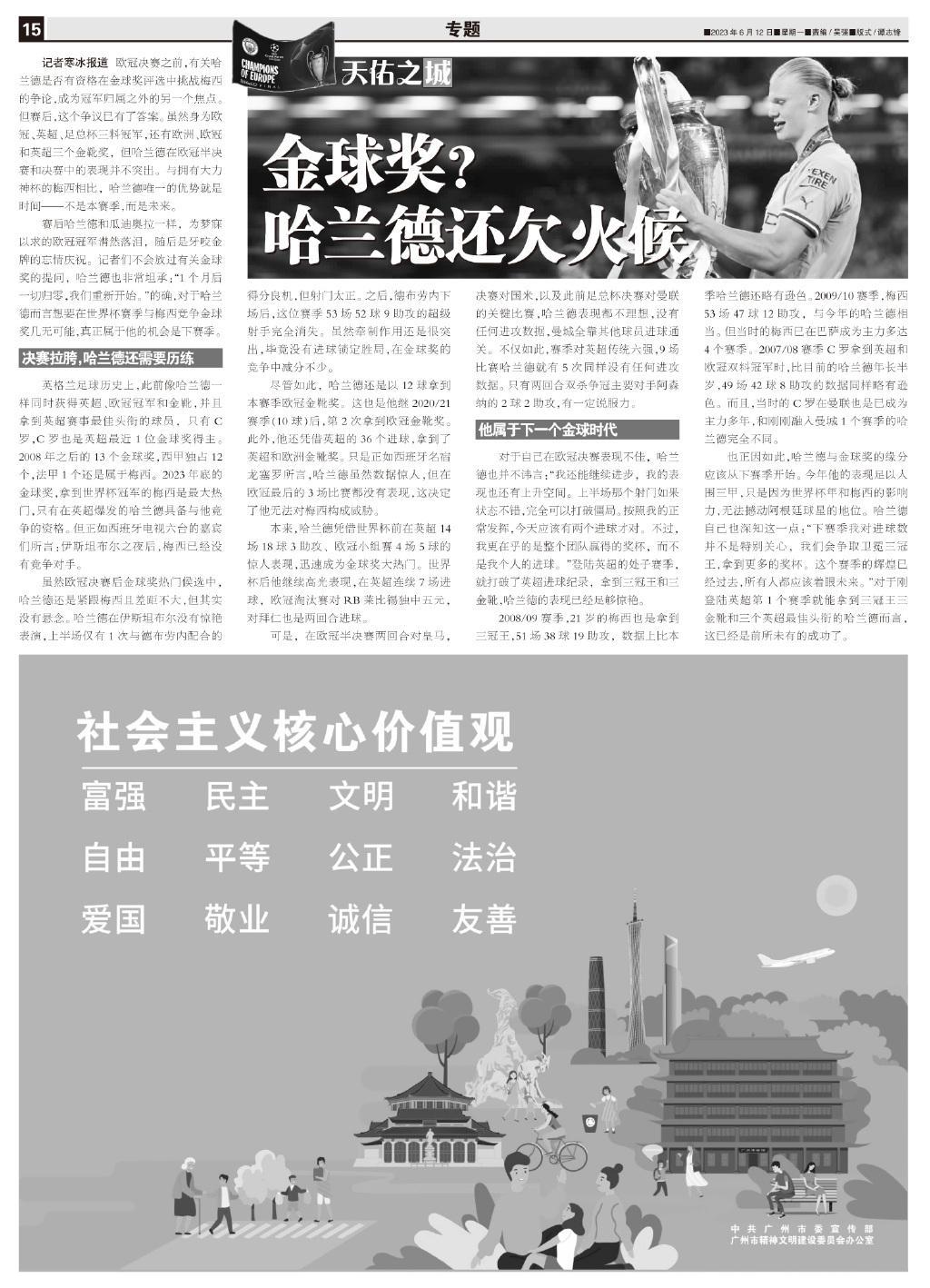 記者寒冰報道 歐冠決賽之前,有關哈蘭德是否有資格在金球獎評選中挑戰梅西的爭論,成爲冠軍歸屬之外的另一個焦點。但賽後,這個爭議已有了答案。雖然身爲歐冠、英超、足總盃三料冠軍,還有歐洲、歐冠和英超三個金靴獎,但哈蘭德在歐冠半決賽和決賽中的表現並不突出。與擁有大力神杯的梅西相比,哈蘭德唯一的優勢就是時間——不是本賽季,而是未來。