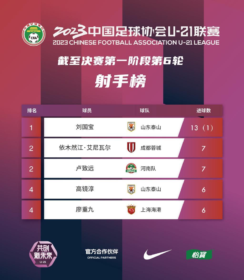 射手榜上,山東泰山隊的劉國寶以13個進球(含淘汰賽階段進球)位居第一,成都蓉城的依木然江和河南的盧致遠以7球並列第二,山東泰山的高境淳和上海海港的廖重九以6球位並列第四。