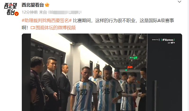 邊裁判周飛被質疑在球員通道向阿根廷巨星梅西要簽名,國內媒體“西北望看臺”直言,在比賽期間出現這種行爲是很不職業的,這是國際A級賽事啊。