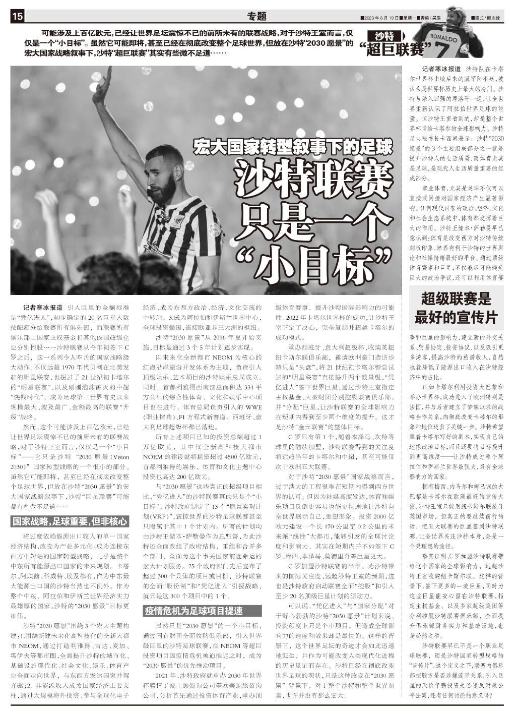 記者寒冰報道 引入巨星的金額標準是“憑億進人”,初步確定的20名巨星人數按配額分給聯賽所有俱樂部,而聯賽所有俱樂部由國家主權基金和其他該國超級企業分別控股……沙特聯賽從今年初簽下C羅之後,這一系列令人咋舌的國家戰略級大動作,不僅遠超1970年代貝利在北美髮起的明星聯賽,也超過了21世紀初卡塔爾的“明星聯賽”,以及剛剛泡沫破滅的中超“燒錢時代”,成爲足球第三世界有史以來規模最大、波及最廣、金額最高的聯賽“升級”戰略。